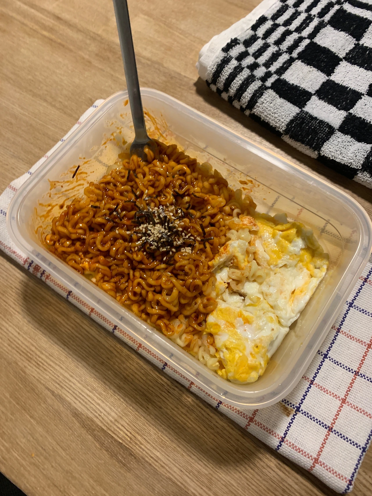 사실 미리 사다 놓은 불닭 볶음면이 없어서, 짜파게티 를 하나 땡겨 쓰고는, 이전에 불닭 볶음면에서 면을 하나 땡겨쓰고 남은 소스를 조합해서 만들었다. 어떻게든 먹고야 말겠다는 의지였다.