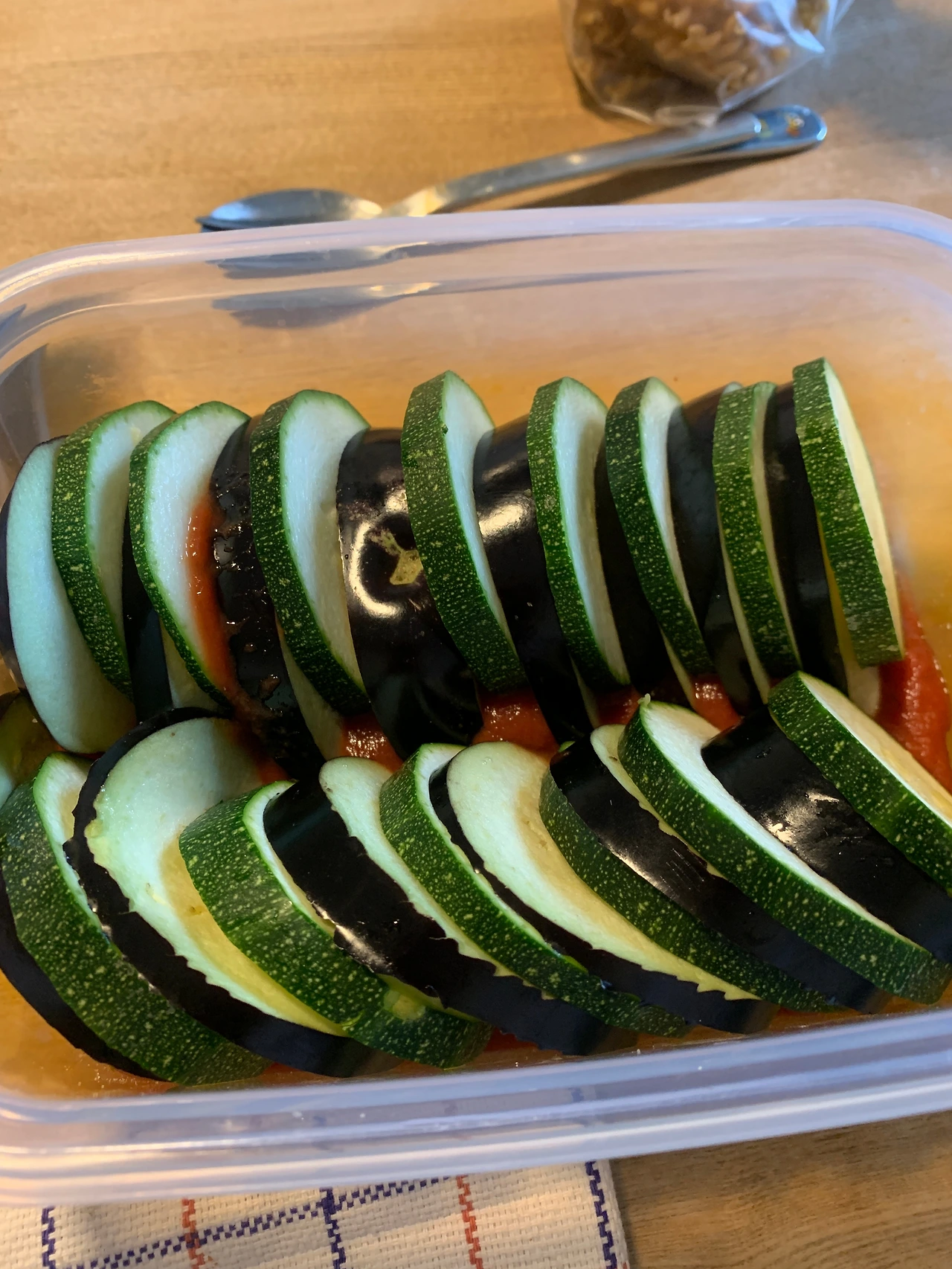 일단 마트에서 쥬키니 호박과, 가지를 사왔다. 주키니 호박 하나와 가지 하나면 두끼정도를 만들어 먹을 수 있다. 밑에는 약간의 탄수화물을 위해서 푸실리 파스타를 깔았다. 그리고는 토마토 소스를 넉넉히 부은 다음에 쥬키니와 가지를 차례차례 쌓는다. 이 쌓는 과정에서부터 이미 힐링이 되는 기분이다. 생각이 많을때 단순 반복 작업이 생각을 없애는데 도움이 되듯이, 잡생각이 사라지는 도움을 준다.