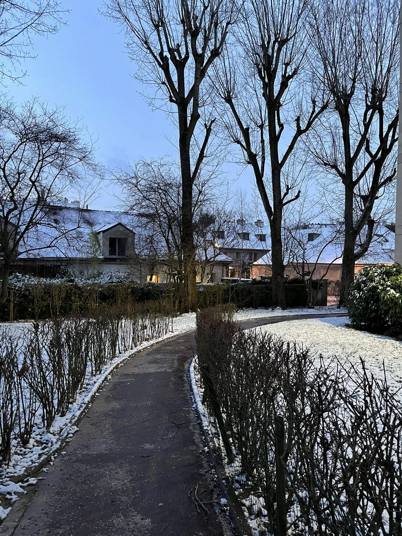어젯밤 몇 시간 동안 눈 예보가 빗나가지 않았다. 아침에 창을 열어보니 눈이 제법 쌓여 있었다. 초록빛 풀이 눈 덮인 위쪽과 선명한 대조를 이루었다. 출근하는데 그제처럼 눈발이 가끔 흩날렸다. 아파트 단지를 빠져나가는 오솔길에 접어들자 눈 뒤집어 쓴 지붕이 동화 속에 나올 법한 풍경으로 변해있었다. 얼른 휴대 전화기를 꺼내들고 사진을 한 장 찍었다. 2018년 2월 말 3월 초에 제법 눈이 많이 내렸다. 오랫동안 녹지 않고 쌓여 있었다. 어렸을 때 총기가 뛰어나다고 칭찬을 숱하게 받았건만 이제 기억력이 한심한 수준으로 떨어졌다. 사진첩을 뒤져보니 2019년 1월과 2021년 1월에도 눈 내린 풍경을 찍은 사진을 발견하였다. 그 이후 눈이 내려 쌓인 것을 본 기억이 거의 나지 않는다. 파리 쪽에 눈이 내려 쌓이는 일은 그야말로 기록할 만한 사건이다. 그 귀한 눈님이 내려 녹지 않고 쌓여 있네!