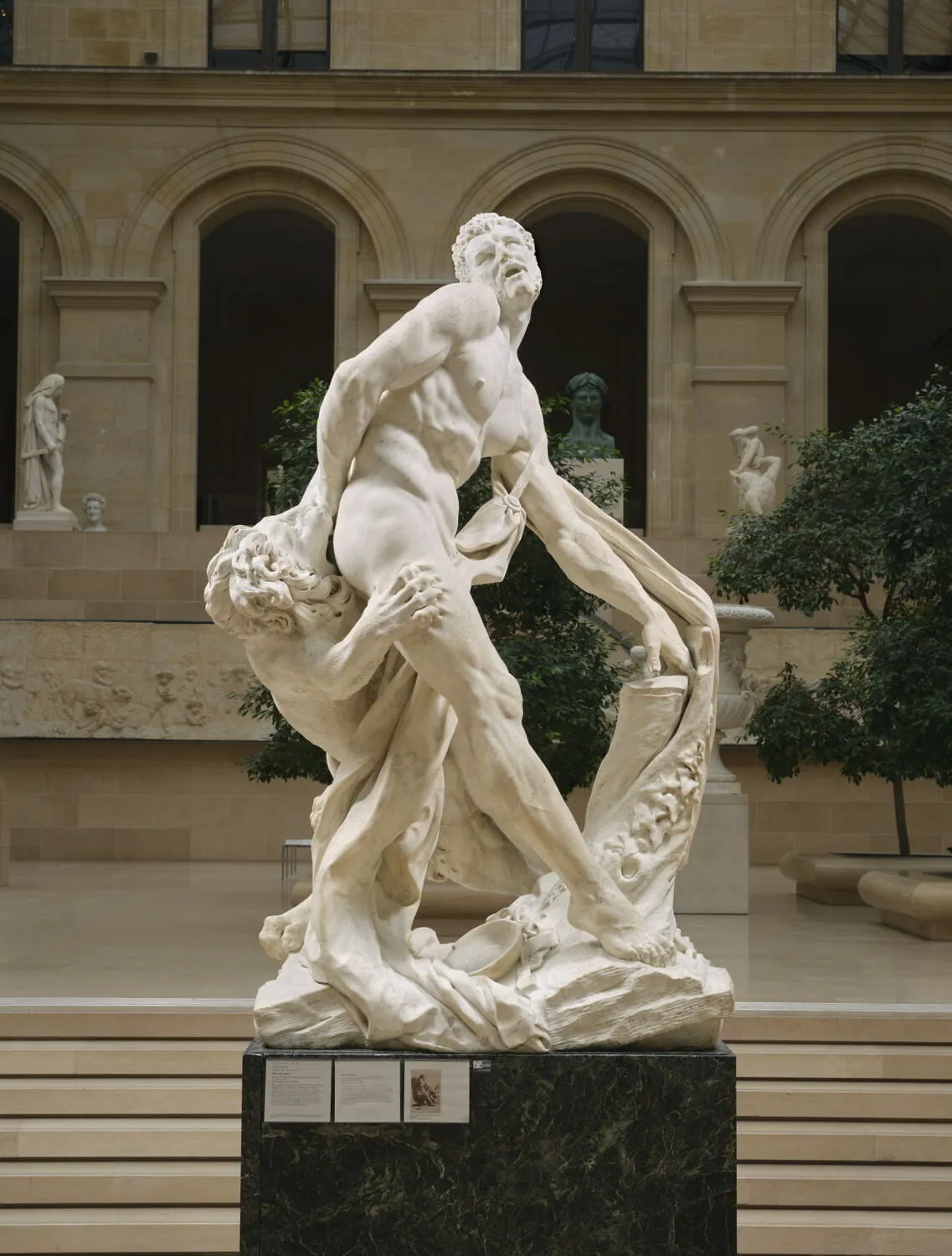 메소포타미아관 들어가기 전 다시 프랑스 조각 전시실 보여드릴게요. 짐검사 하러 가던쪽이에요. 저기 가운데 세 사람 구경하는 조각보세요. 고대적 영웅으로 올림픽 경기에 나가 금메달 네 개, 아폴로 축제 경기에서 금메달 여섯 개 땄던 영웅이 나이가 들어 왼손이 참나무 틈에 끼었어요. 젊은 시절 생각하고 빼려니 안 빠지는 겁니다. 잘 안보이지만 뒤에 들러붙은 게 사자에요. 사자가 들러붙어 오른손을 물어뜯고 있어요. 나이들면 이렇게 된다. 조각가가 절대왕권을 휘두르던 루이14세한테 경계의 뜻으로 갖다받쳤을까요. 밀론이라는 고대적 영웅이야기입니다.