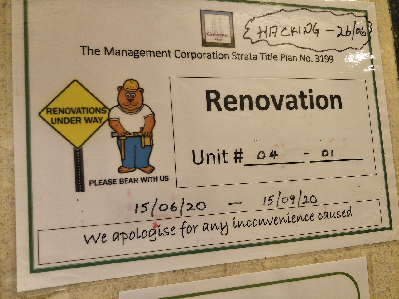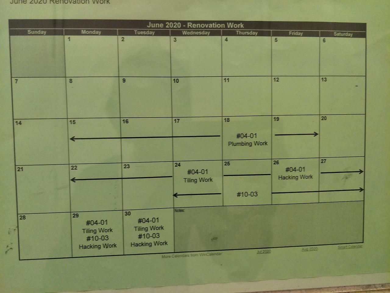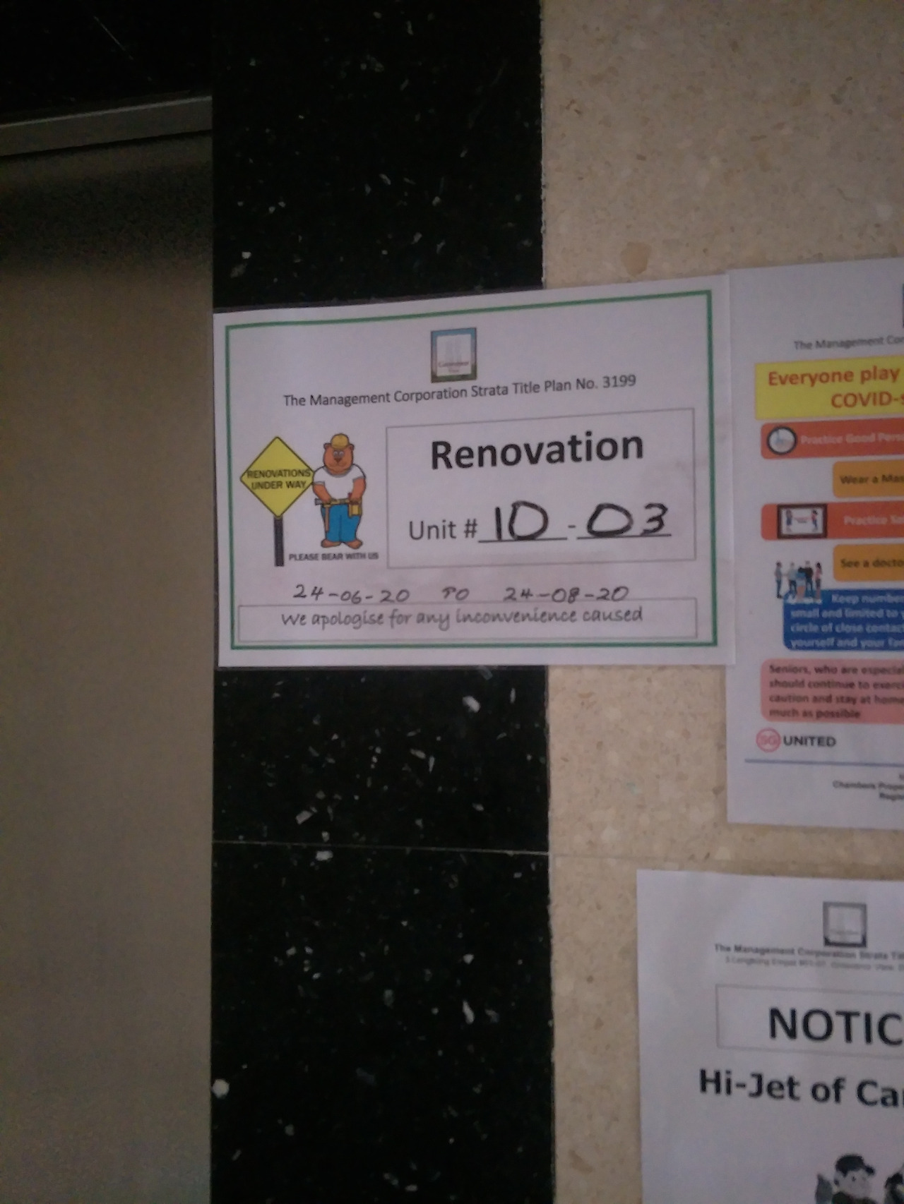 HDB라 불리는 공용주택도 그렇지만 콘도의 경우도 마찬가지로 주말이나 공휴일 즉 입주자들이 집에서 휴식을 취할 시간(물론 외출해서 없을 가능성도 높지만)에 이웃에게 피해가 갈 수 있기 때문에 하기의 내용들은 금지되어 있으며, 설사 업자들이 가능하다고 해도 입구에서 출입 제한 당하기에 작업을 진행할 수가 없다.