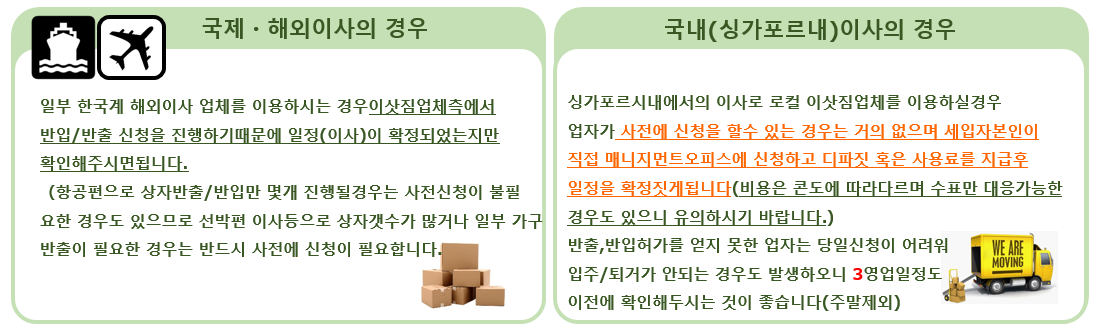 가령 이미 싱가포르에 살다가 다른 콘도(집)로 이사 갈 경우, 현재 사는 콘도(반출)와 이사 갈 콘도(반입) 신청을 둘 다 별도로 진행해야 한다.
