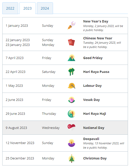 우리나라의 큰 명절은 설날과 추석이고 설날도 양력(New year's day)과 음력(Lunar New year's day or Chinese New year)으로 나뉘고 일본에서는 원단(元旦)이라 부르는 양력설 과 추석과 비슷한 お盆(오봉)이 있다. 싱가포르에서는 중국계는 음력설(심지어 챠이니즈뉴이어라 부르지 않는가)이나 Mid-Autumn Festival(중추절/우리나라 추석)이 해당된다고 볼 수 있다. 말레이시아/무슬림들은 "하리라야(Hariraya Haji와 Hariraya Puasa)-라마단(금식)이 끝나는 날"이, 인도계는"디왈리/디파발리(Deepavali)"가 있어 싱가포르에서는 공휴일로 지정되어 있으니 이날은 이사날짜로 지정할 수 없다