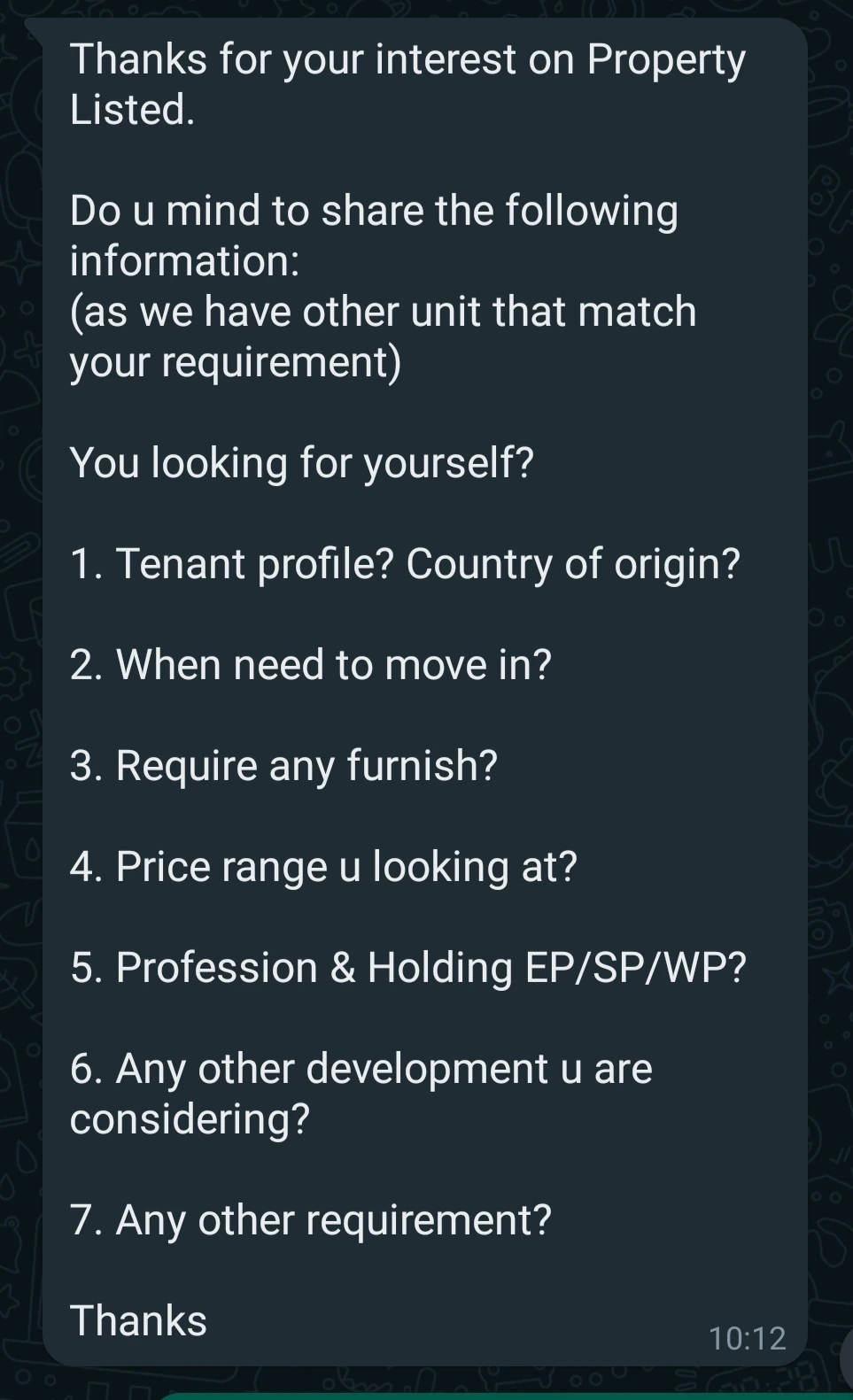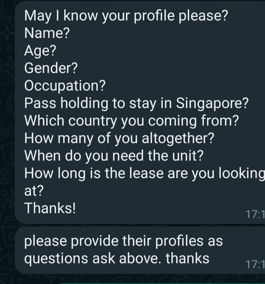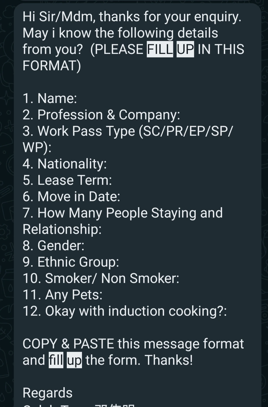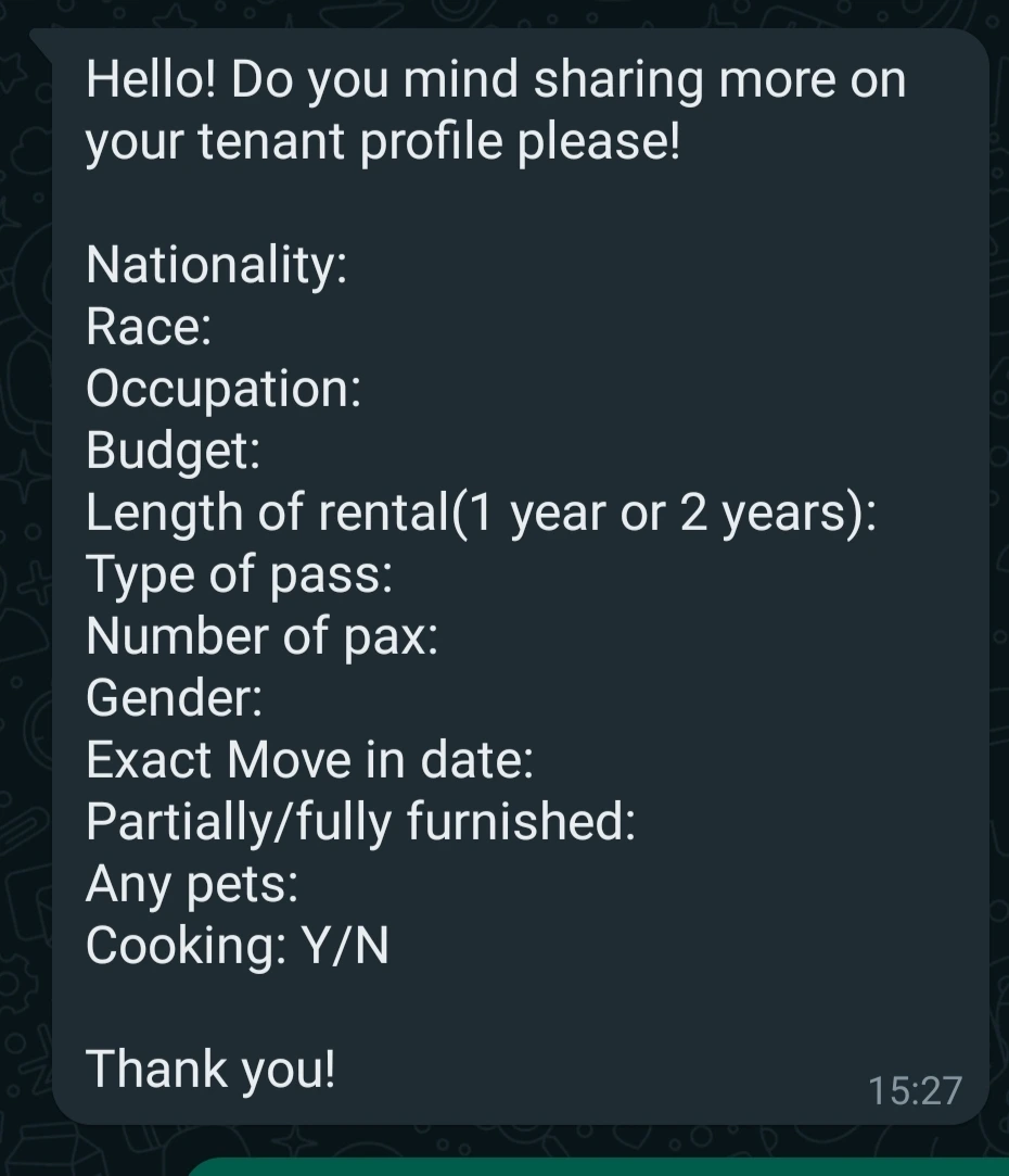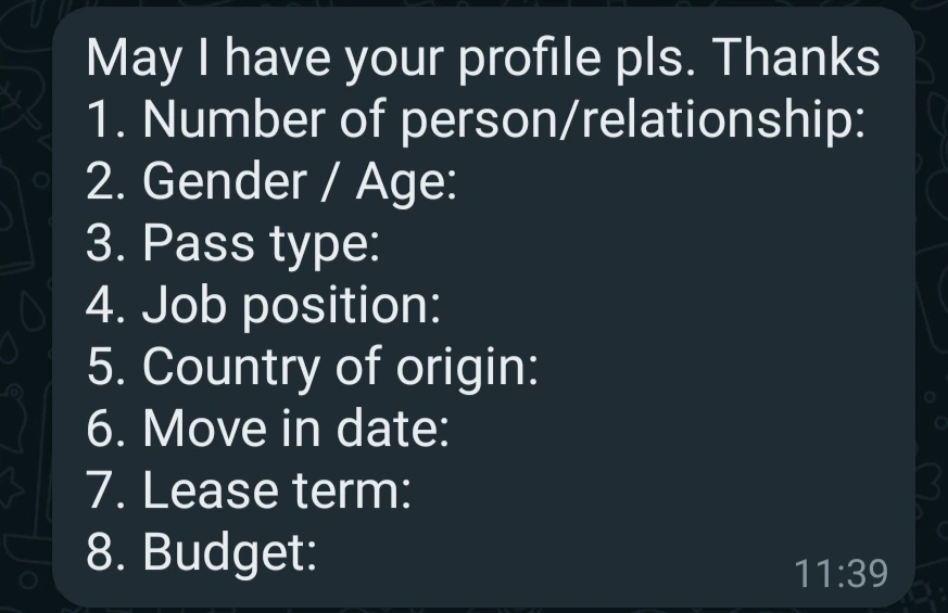 집주인이 세입자 프로파일일 알아야 뷰잉을 허락하는 경우도 있으나 반드시 위 포맷을 입력해야만 뷰잉이 가능하다면 계약후에도 휘둘릴수 있는 가능성이 높다는 점
