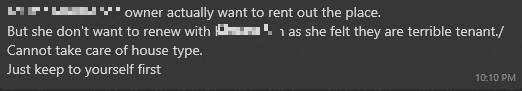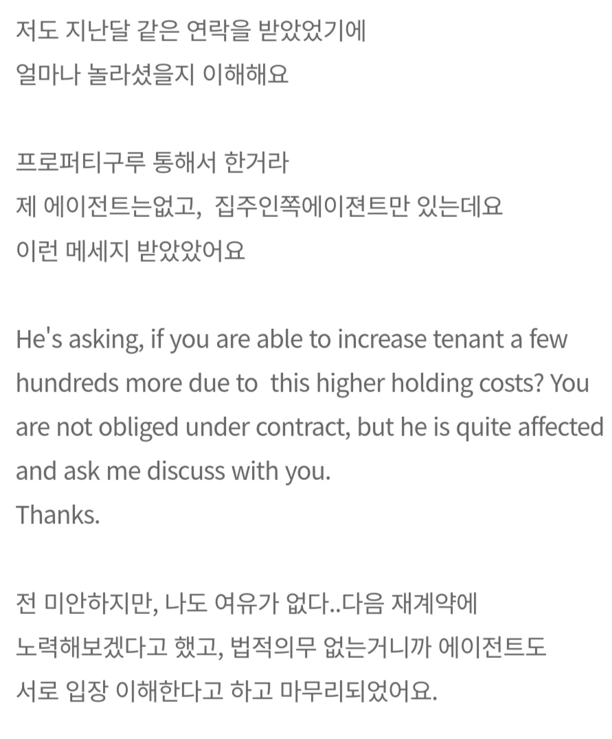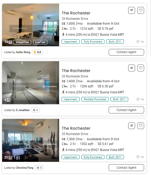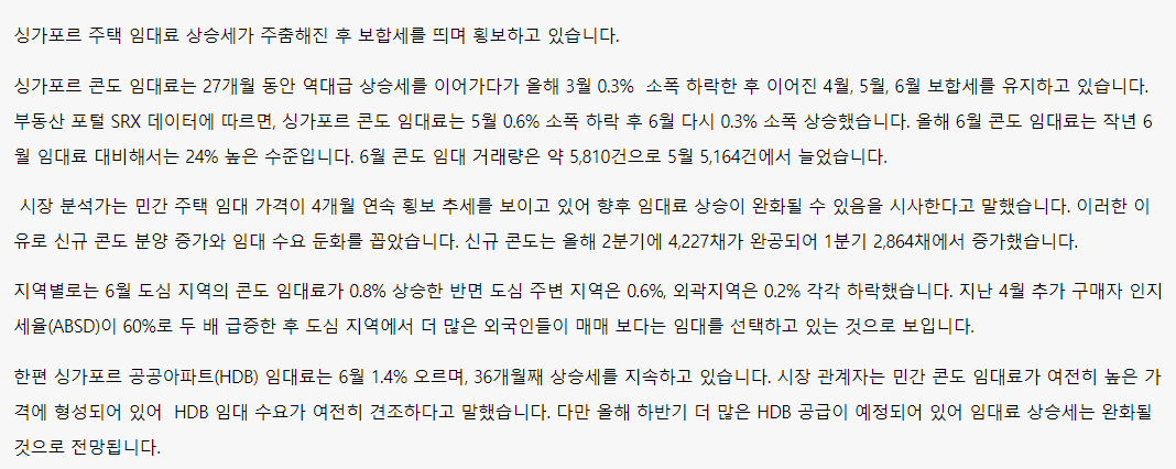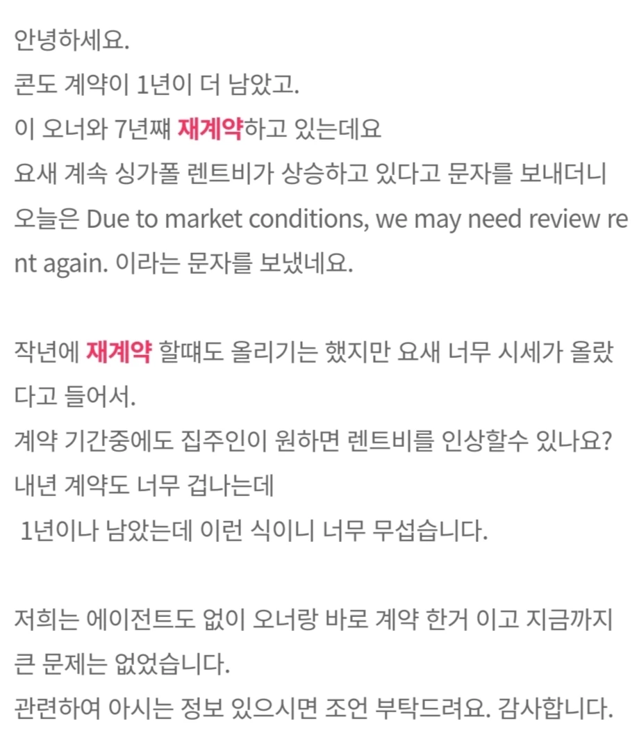 사례. 2021년 10월 방 2개 SGD $5450으로 2년 계약을 한 손님, 앞으로 2년 더 살고 싶다고 재계약 의사를 밝혔고 집주인에게 의향을 묻자 SGD $8000로 올리자는 답변을 받았다.