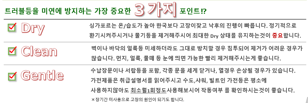 욕실주위는 (물기 없이) 건식으로 사용해 주시고, (환풍기 있다고 밖으로 연결된 게 아니니) 문 열어서 환기도 자주 시켜주시고.. 자세한 것은 책자에 설명이 있으니 바쁘시더라도 반드시 한번 읽어주시는 게 좋아요.