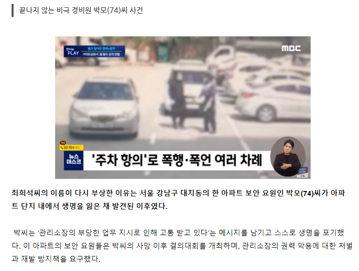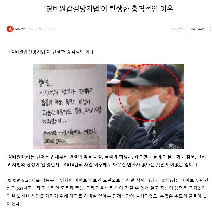 지난 2일 서울 노원구의 한 아파트 주차장. 고성이 울려 퍼졌다. 경비원은 얼음처럼 굳은 채 서있었다. 집에서 키우던 화분의 흙을 아파트 화단에 버리면 안 된다고 안내하자 입주민이 반발했던 상황. 큰 소리에 주변의 시선이 몰린 탓일까, 입주민이 자리를 피하며 상황은 일단락됐지만, 경비원은 억울하고도 난처한 표정을 감추지 못했다. 이곳에서 5년째 일하고 있다는 경비원 김 모 씨(68)씨는 “한쪽에선 내 돈으로 월급 받으면서 별 걸 다 참견한다는 말을 듣고, 한쪽에선 월급 받고 일 안 하냐고 항의한다”며 “경비원은 갑질을 참는 직업”이라고 푸념했다.