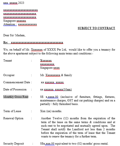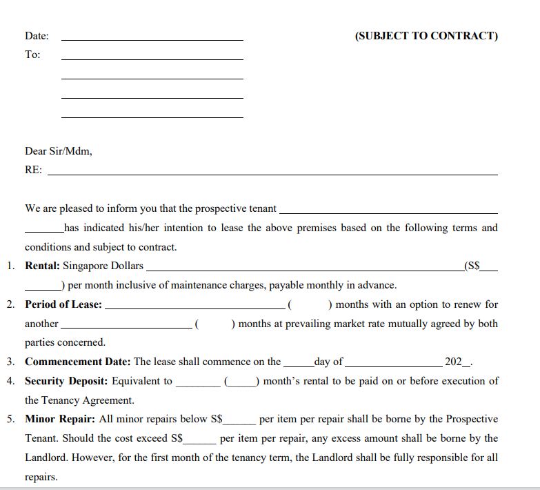 A Letter of Intent (LOI) is a document that outlines a preliminary agreement between two parties before a deal is finalised. In Singapore, a prospective tenant would give an LOI to a landlord to express his intention of renting a particular property from the latter.