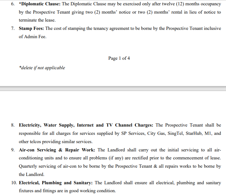 외교/중도해약 조항은 2년 계약 중 12개월 체류 후 2개월 전에 집주인 측에 알리면 중도해약할 수 있다는 내용으로 최소한의 체류일정이 정해져 있다. 2년 계약이라면 12개월(1년)+ 2개월 전 통지로 묶어버림으로써 총 14개월의 월세는 지불해야 한다는 내용에 해당한다. 싱가포르를 떠나지 않는 이상 본 조항은 사용할 수가 없고, 1년 계약에는 중도해약 조항이 포함되지 않는 경우가 일반적이다. 계약종료 통지를 하고 두 달 더 월세를 낼 수도 있으나 도중에 해약할 경우 집주인에게 중개수수료를 반환해야 한다. 그러나 약식에는 페널티가 발생하는 내용에 대해서는 정확하게 기재되어있지가 않다. 법으로 정해진 것은 아니나 암묵적인 관례이기에 외국인으로서는 모르는 경우가 많다. 물론 모른다고 면제가 되지 않는다.(좀 더 자세한 내용은 추후 별도 설명)
