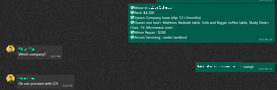 매우 간략하지만, 같이 계약체결을 해본 중개인끼리라면 많은 말이 필요치 않다. 위의 내용은