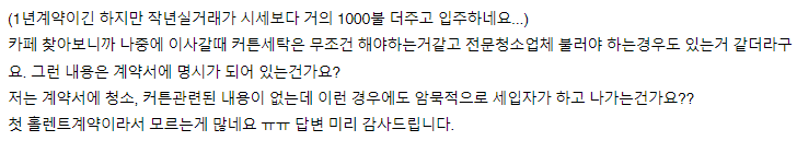 TIP : 집을 볼 때 커튼이 많은 것보다는 블라인드가 설치되어 있다면 나갈 때 조금 더 돈을 절약할 수가 있다 단, 드라이클리닝이든 스팀클리닝이든 해야 하나 만약에 입주당시 전세입자 혹은 집주인이 이 부분을 제대로 하지 않았다면 나갈 때 면책여부를 확인해 보고 서류로 남길 것. 기브 앤 테이크는 확실히 해야지 싶다면 입주 시에 드라이클리닝 영수증 제시를 요청할 수도 있다는 것을 알아두자