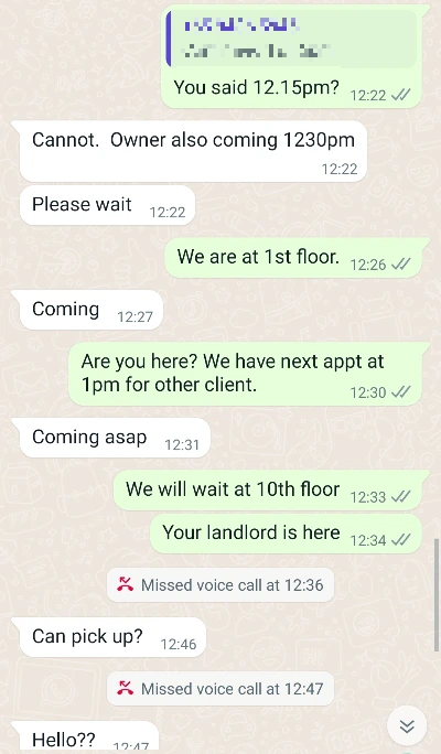 *뷰잉 할 때 한 곳당 대략 20분+이동시간, 다음집 식으로 시간이 짜인다. 따라서 뷰잉이 20분이 지체되었다는 것은 다음에 잡혀있는 일정(이날은 다른 손님과 3군데가 더 잡혀있었다)이 마치 도미노 쓰러지듯 줄줄이 밀리게 되고, 다음 중개인이나 세입자들이 즐줄이 대기해야 함을 의미한다. 가령 한 군데당 20분씩 늦어지면 마지막 중개인/세입자는 무려 1시간 이상을 기다려야 하는 경우도 생기는 것이다. 따라서 일정시간 늦어지면 뷰잉 캔슬당하는 경우도 꽤 있기에 시간 조절/엄수는 매우 중요하다. 경험 좀 있는 중개인이라면 모를 리 없고 최소한의 예의로서 지켜야 하는 기본이라 할 수 있다.