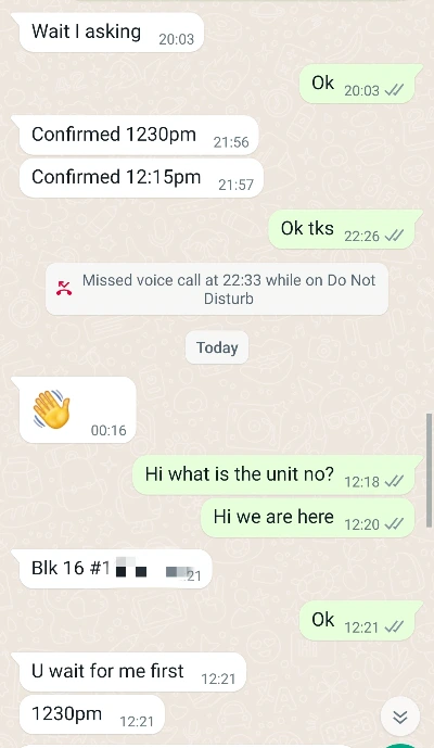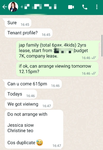 *싱가포르의 경우 매물 광고에 매물의 동, 호수는 기재하지 않는 경우가 일반적이다. 따라서 설령 같은 집이라 해도 약간 분위기가 다른 사진에 다른 매매가로 올라와있는 중복광고나 피싱용(이미 다른 사람이 계약을 했으나 광고는 그대로 두고 연락하면 전혀 다른 매물을 안내하는)도 꽤 많다. 특히 대부분의 중개인이 뷰잉 몇 시간 전까지 내지는 현지에 도착하기 전까지 동, 호수를 가르쳐주지 않는 경우는 흔해서 미리 확인하지 않으면 같은 방을 두고 여러 명의 중개인과 약속을 잡게 될 수도 있다.