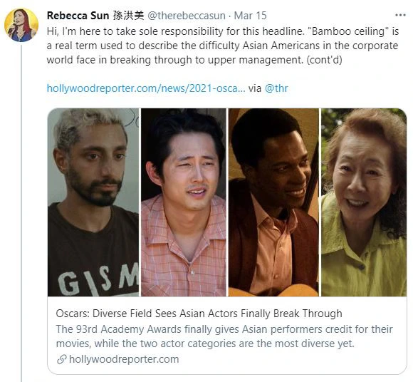 2021년 오스카 후보자들에 동양 배우들의 "뱀부 실링"이라는 표현을 써 논란이 된 보도. 뱀부 실링의 차가운 현실들을 표현하고자 쓴 용어라 다시금 되풀이한 작가의 X 글까지도 기사화가 되었다.