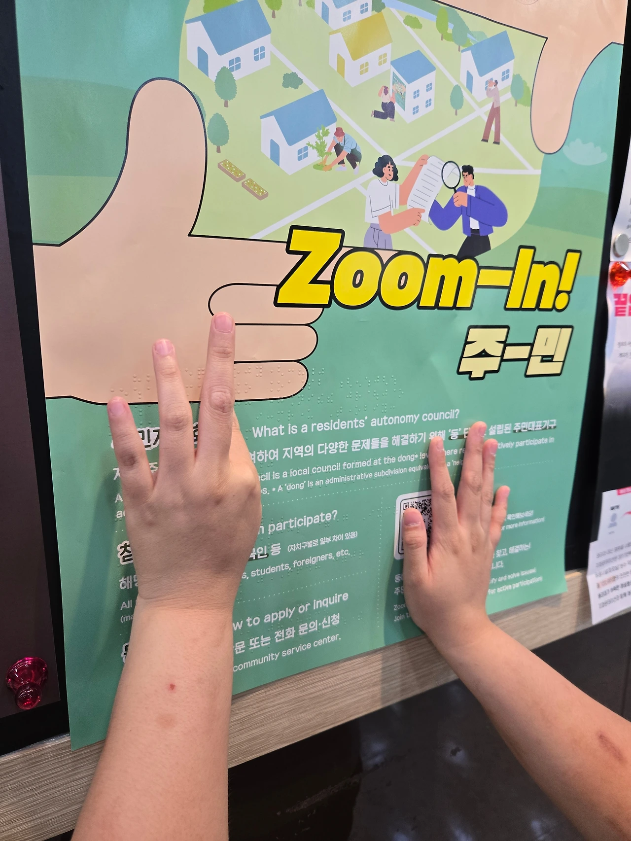 점자가 표기된 포스터를 보고는 반가운 마음에 그녀에게 읽어보라고 알려줬다.