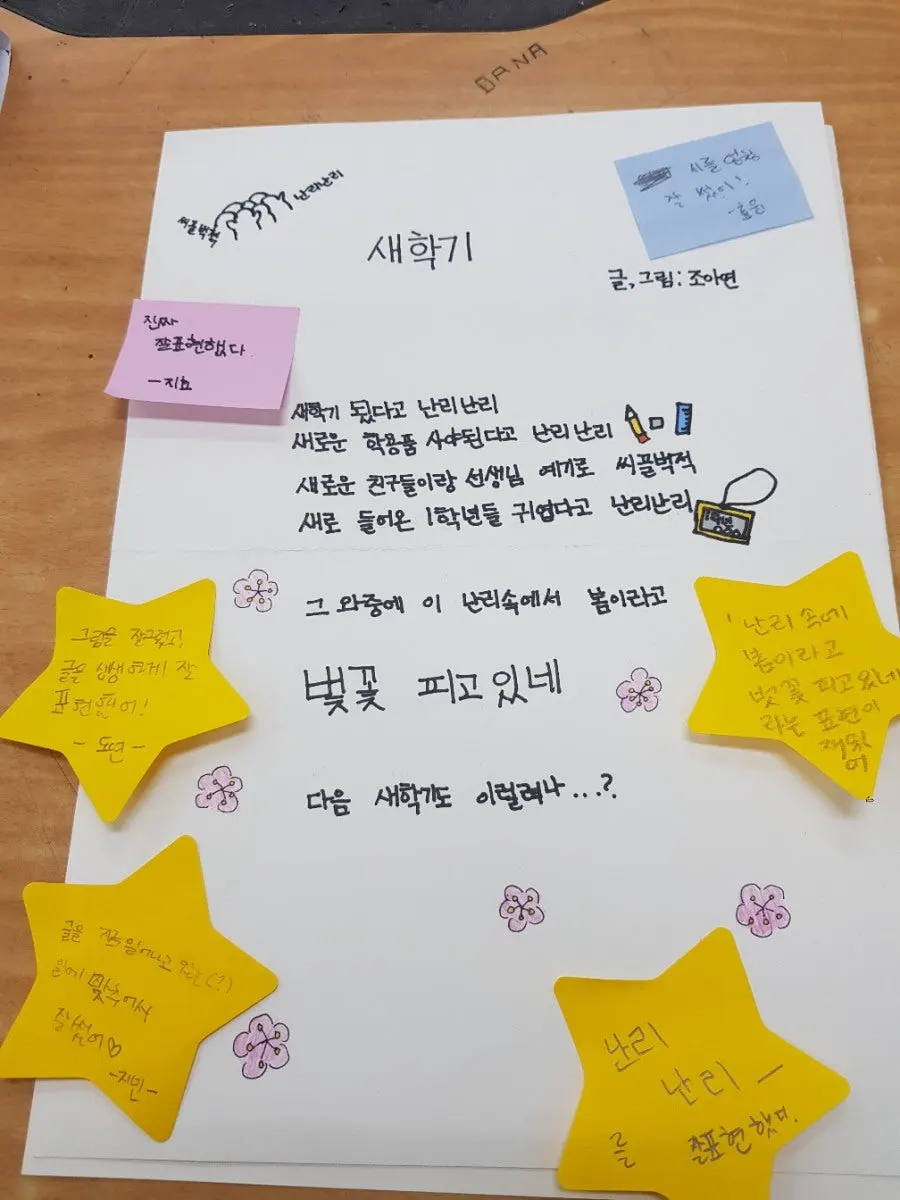 새로운 친구들이랑 선생님 얘기로 시끌벅적