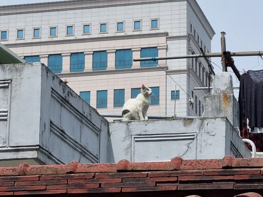 옥상 위에서 하늘을 바라보는 길고양이를 발견했다.
