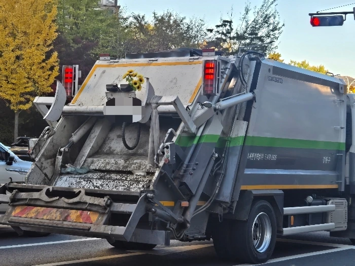 그저 가짜 꽃 몇 송이가 놓여 있을 뿐인데도 청소차는 어제와 전혀 다른 얼굴을 하고 있다.