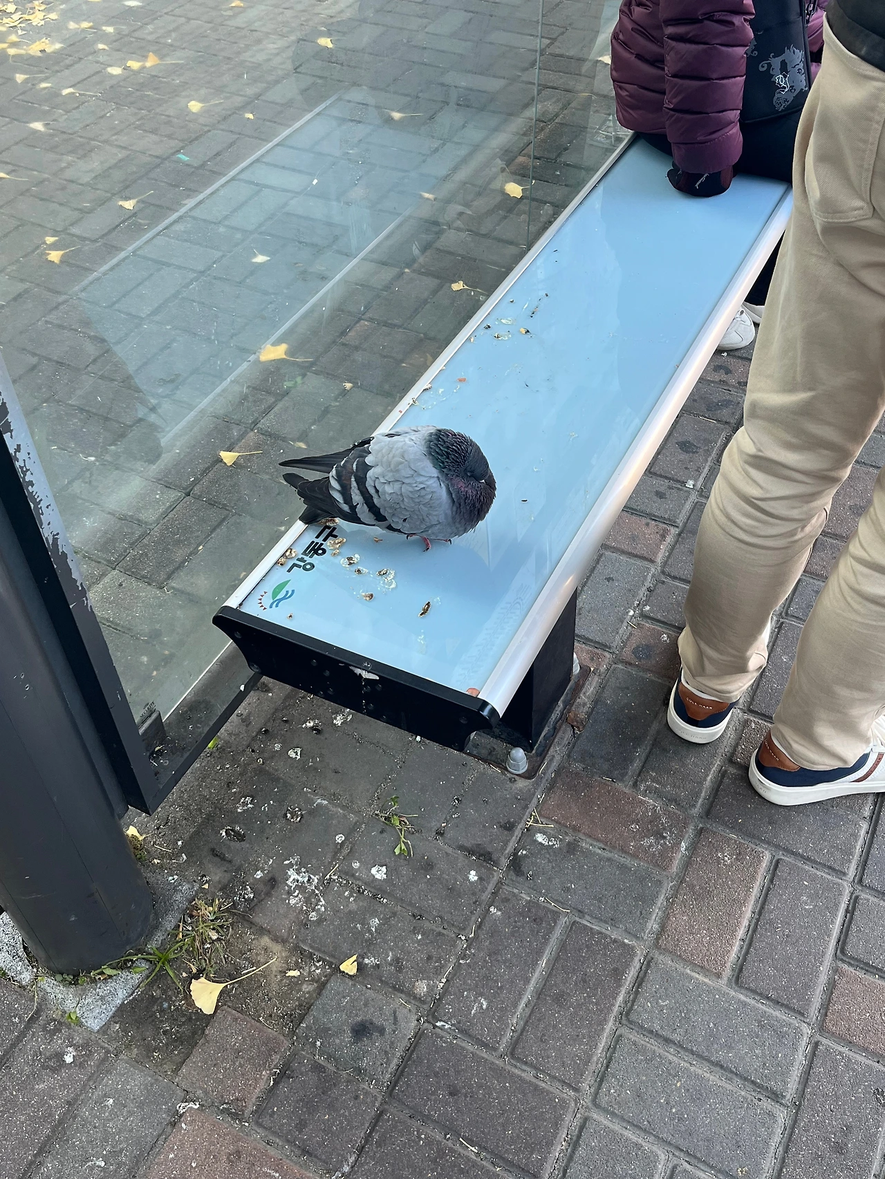가까이서 보니 비둘기 한 마리가 열선 의자 한 켠을 차지하고 있었다.