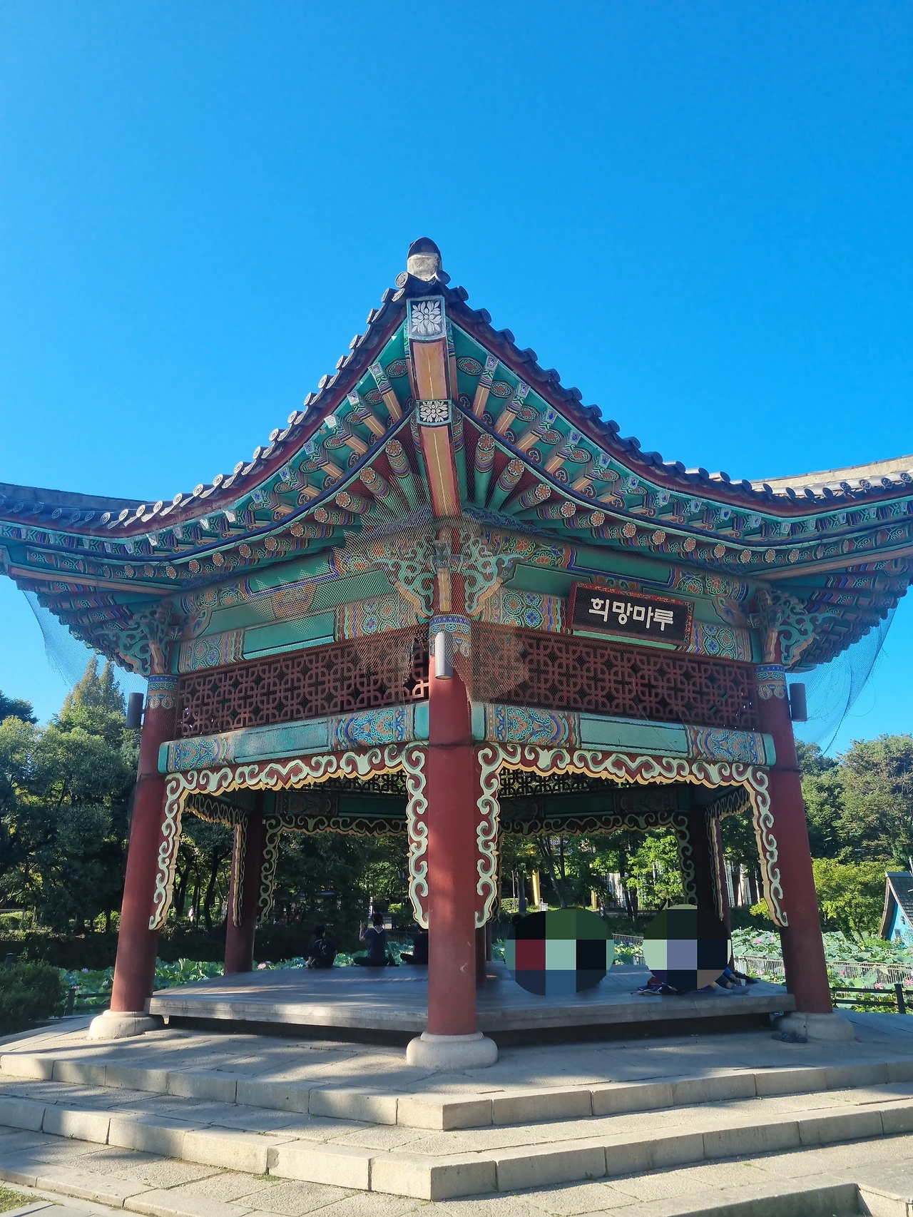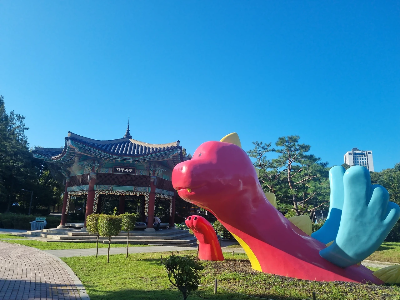 정문 옆으로 '희망마루'라는 정자에는 사람들이 편히 쉬고 갈 수 있도록 넉넉한 자리가 준비되어 있다. 나도 마루에 걸터앉아 다리를 쭉 펴고 하늘을 보며 숨을 고르곤 한다. 정자 앞에는 공원을 지키는 커다란 조형물이 하나 있는데, 나는 이 친구에게 '용용이'라는 이름을 붙여주었다. 어쩌다 땅 속에 몸이 반쯤 묻히고 하늘로 날아가지 못하는 걸까? 용용이의 사연이 궁금하지만 갈 때마다 반갑게 인사해 주니 얼마나 고마운지 모른다.