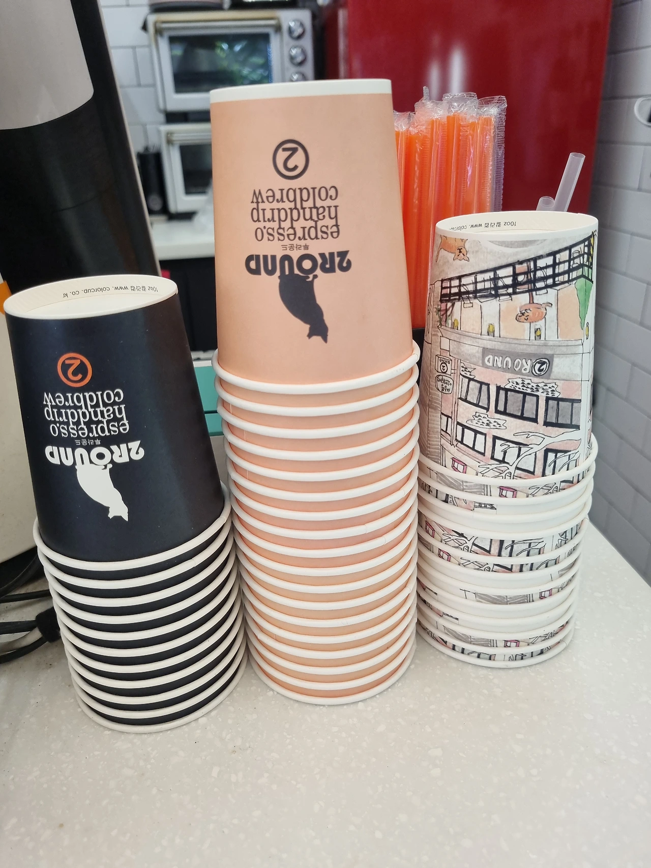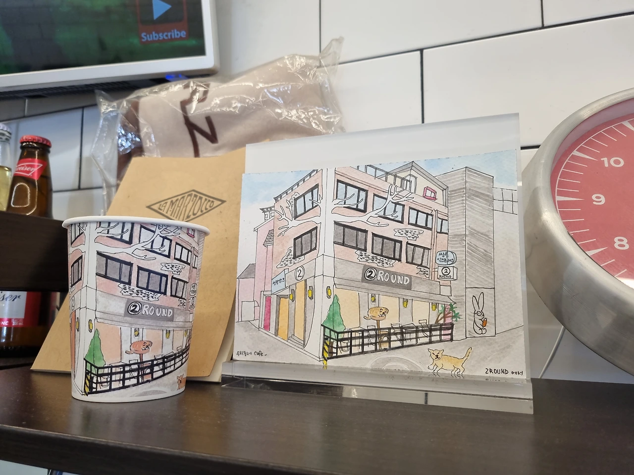 좋아하는 장소를 그리다 보니 이 카페도 그리게 되었고, 기왕 그린 김에 색칠까지 해서 사장님께 선물로 드렸다. 부끄러운 실력이었지만 사장님은 기쁘게 받아주셨고, 카운터 앞에 전시까지 해놓으셔서 은근히 보람 있게 생각하고 있었다. 그런데 얼마 전 딸이 종이컵 하나를 가져왔는데 어딘가 익숙한 그림이었다.