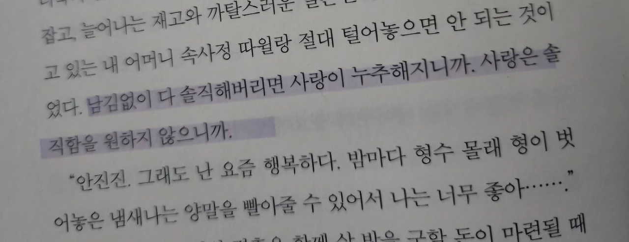 남김없이 다 솔직해버리면 사랑이 누추해지니까, 사랑은 솔직함을 원하지 않으니까.