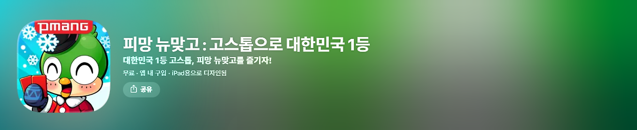 아이폰 사용자도 피망 뉴맞고 무료설치가 가능해요. App Store 접속 후 검색창에 '피망 뉴맞고' 입력하고 해당 앱 선택 후 '받기' 버튼 터치하세요.