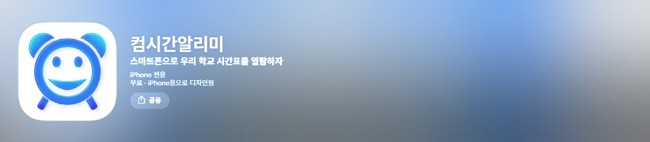 아이폰은 앱스토어에서 '컴시간알리미'를 검색하면 됩니다. 안드로이드와 다르게 학생용, 교사용이 하나로 통합되어 있어요. 앱 실행 후 '학생용 시간표' 탭을 선택하면 학생용으로 이용할 수 있습니다. 학부모님이 자녀 시간표 확인용으로 쓸 때도 학생용 시간표 탭을 선택하시면 돼요.