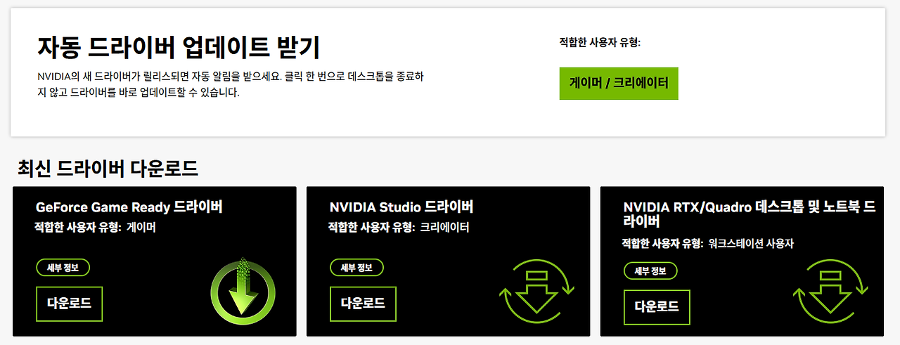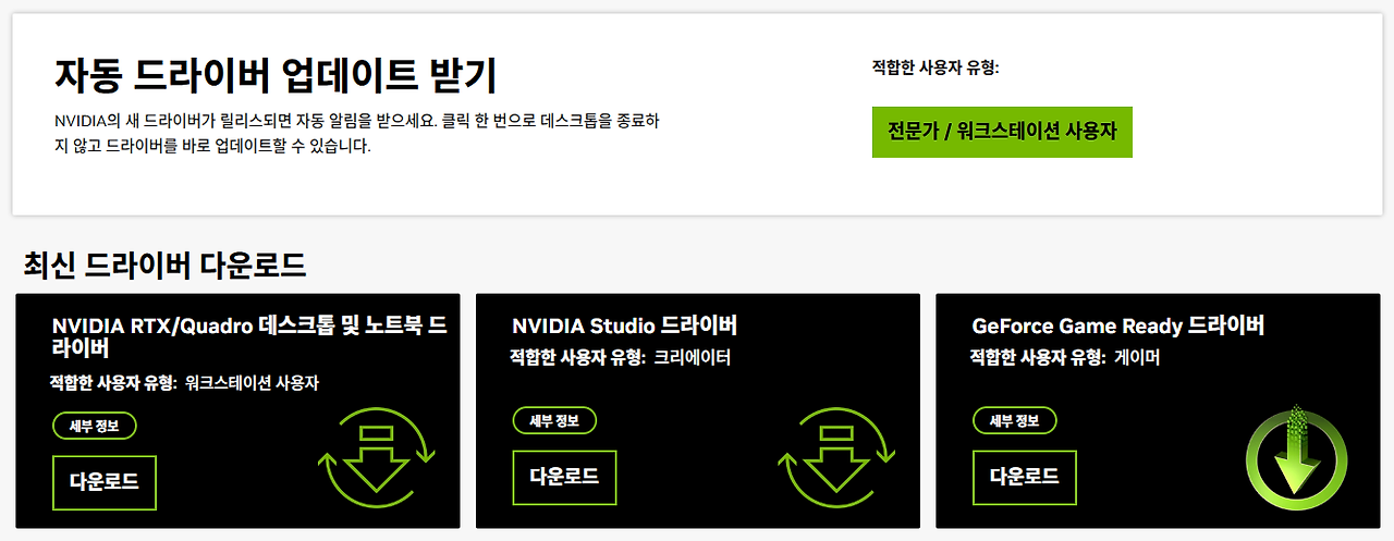 엔비디아 드라이버는 두 종류가 있어요. 용도에 맞게 선택하세요.