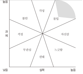 이 그래프에 따르면, 인간은 높은 실력으로 높은 수준의 과제를 수행하는 과정에서 몰입합니다. 즉 몰입은 도전적인-쉽지 않지만, 그렇다고 아주 버겁지도 않은-과제를 극복하는 과정에서 실력을 온통 쏟아부으면 나타나는 현상이지요. 과제는 힘겨운데 실력이 뒷받침해 주지 않는다면, 사람은 불안과 걱정에 시달리다가 제풀에 포기하고 맙니다. 과제와 실력의 수준이 모두 낮으면 아무리 경험해도 미적지근할 뿐이겠지요. 몰입하려면 도전적인 과제와 높은 실력이 결합해야 합니다.