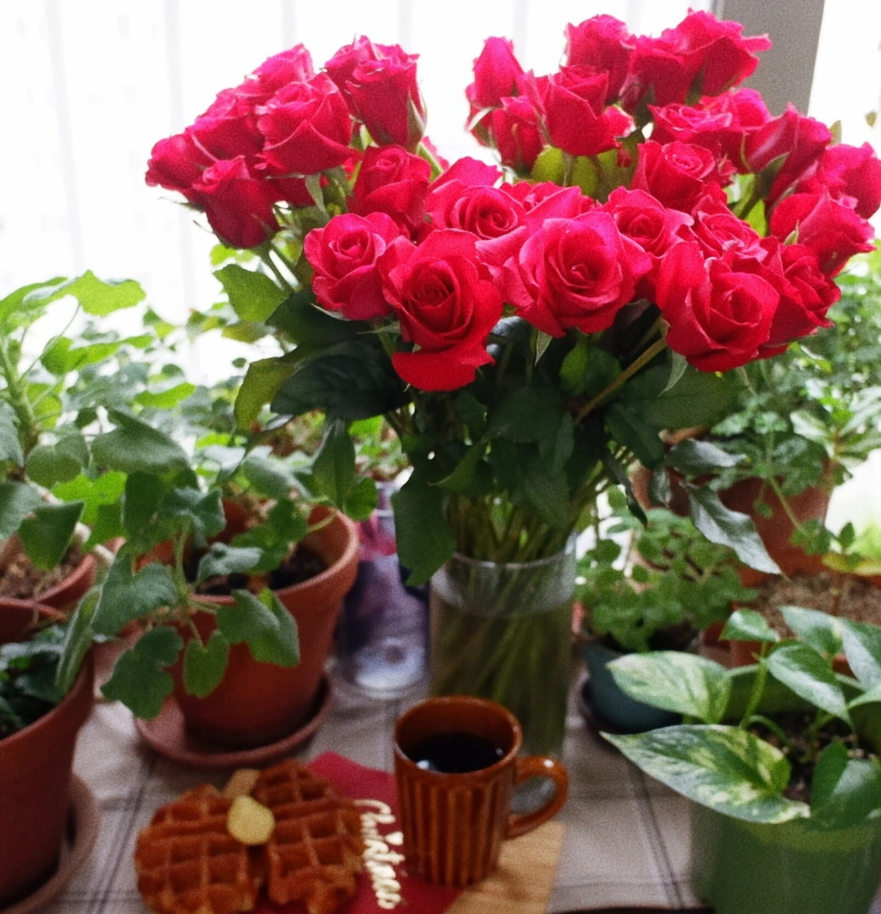 빨간색 그대로 겹겹이 펼쳐지는 크고 화려한 화형에서 레드 장미의 새로운 매력을 보면서 빨간 장미의 찐한 색감과 싱그러움이 만남의 분위기와 잘 어우러진다는생각이 든다.