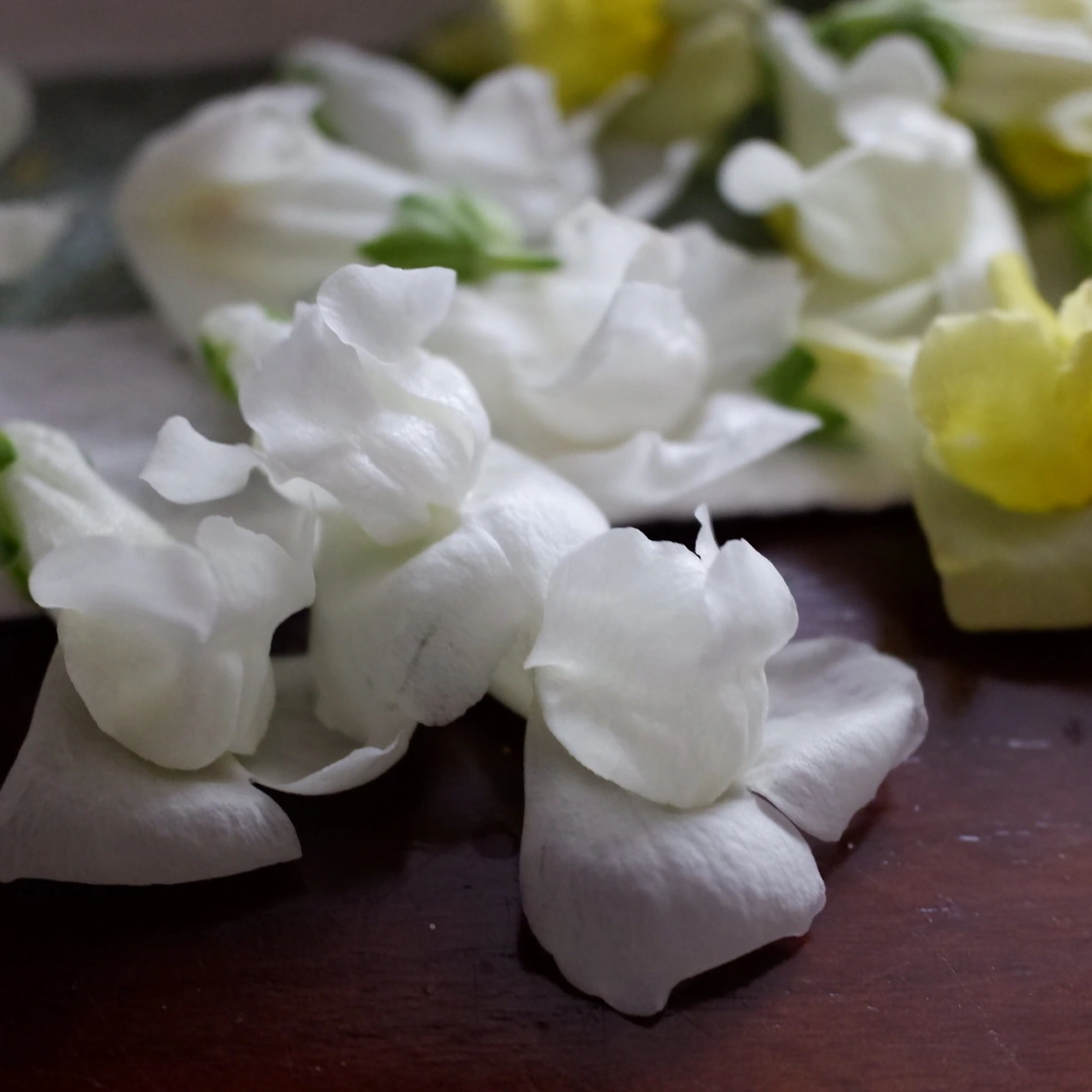 화병을 넘겨 밖으로 밀려난 꽃송이들이