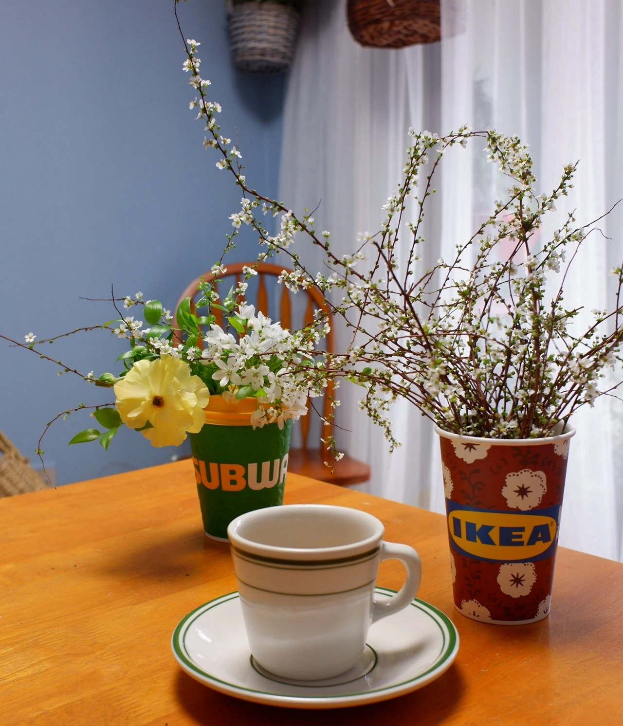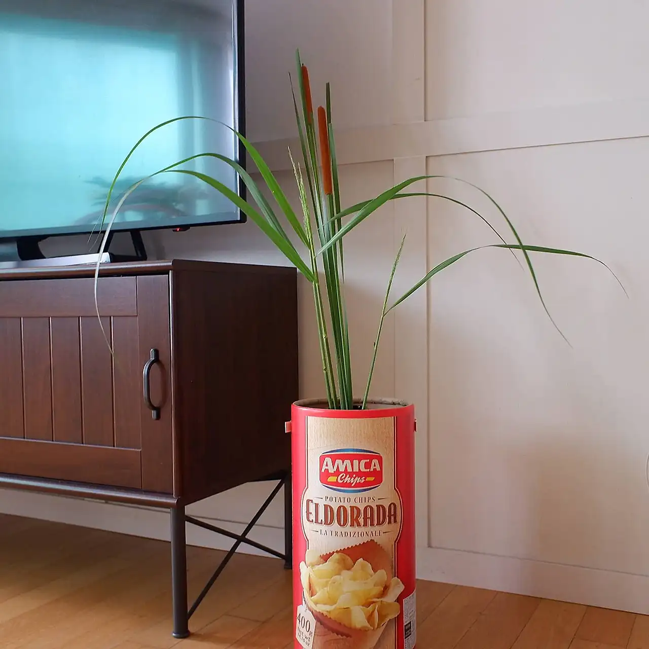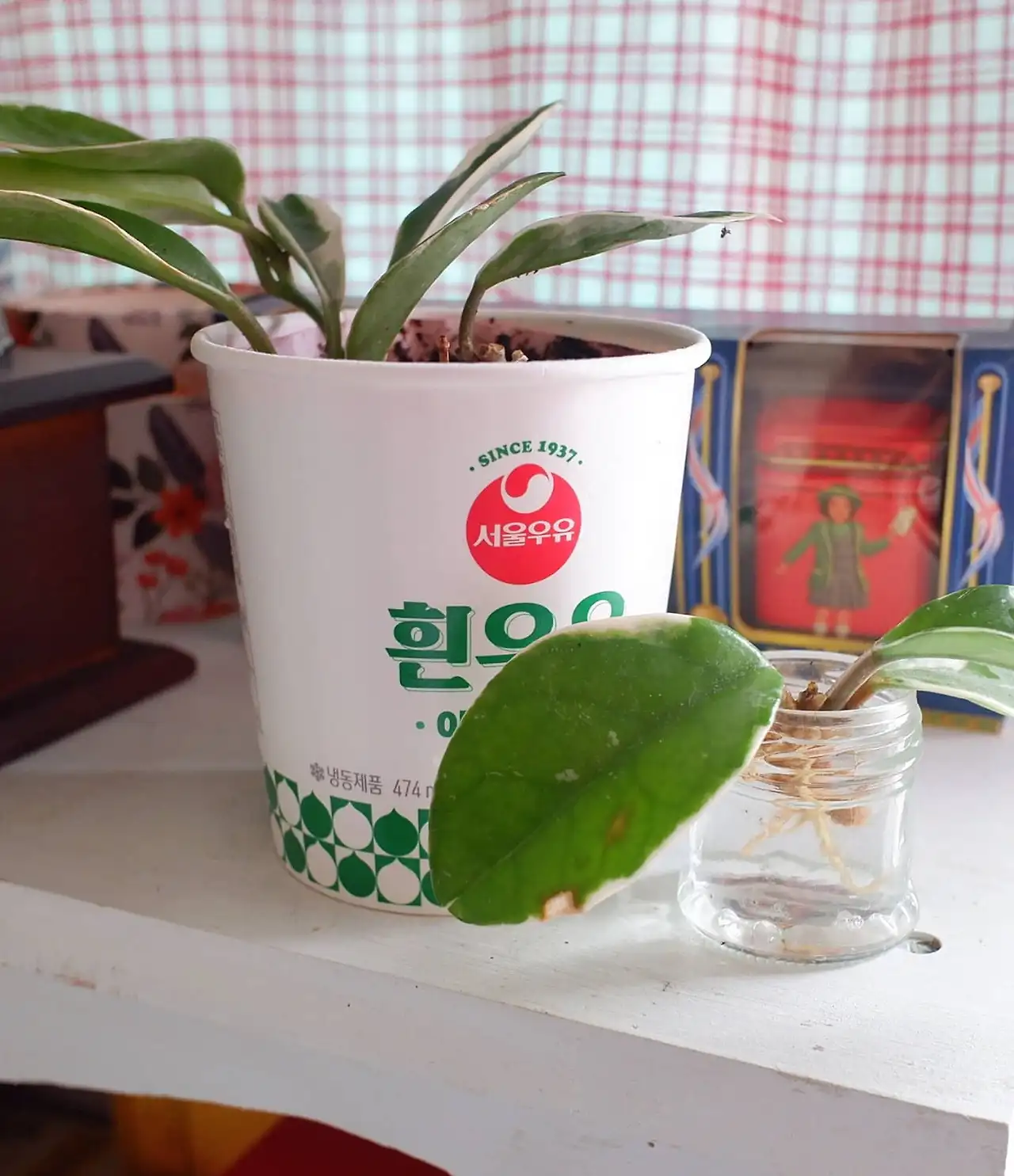 플라스틱 물통에 담긴 보리사초 몇 대와 부들 두 대는 기다란 감자칩 종이통에서 그린 그린 하며 TV장 옆에 기다란 잎을 펼치고 있고, 거실 창 한쪽 커튼봉에는 패브릭 실로 꼬아 만든 걸이에 플라스틱 음료컵을 화분받침으로 베란다 아이비즐기 잘라 넣은 미니화분이 매달려 있다. 작은 테이블에는 아이비 줄기 담긴 커피캔이, 주방창 앞 커피코너에는 호야 줄기 뚝 잘라 넣은 초록과 빨강이 선명하게 박힌 흰 아이스크림 빈통과 미니 잼병이 놓여있다.