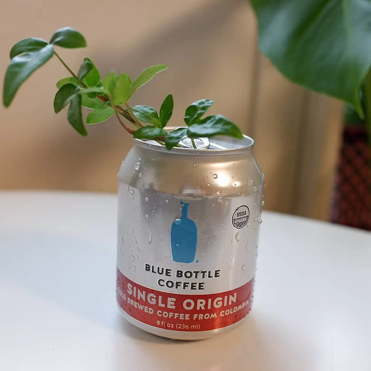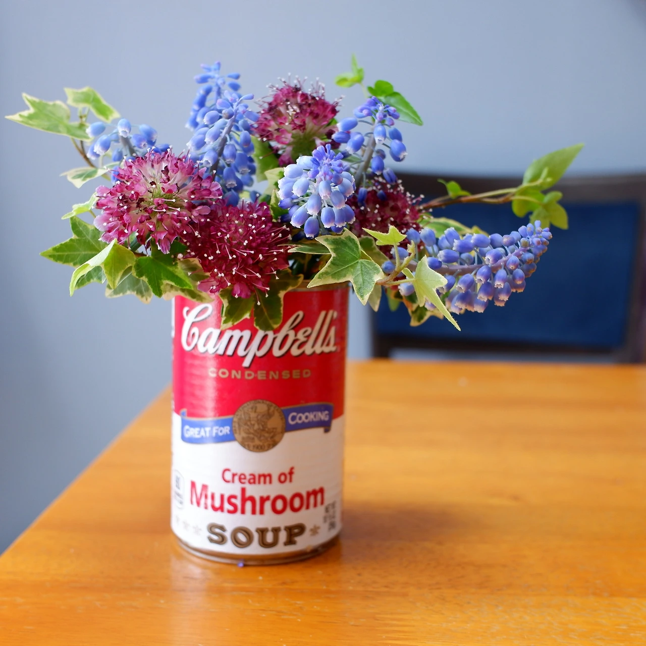 두어 번 바니쉬를 발라 둔 양송이 수프 캔은 붉은색과 흰색의 대비가 적절하여 초록 아이비 줄기 몇 개 잘라 짧은 길이의 꽃송이와 함께 넣어주었더니 식탁 한쪽에 올려두기 딱 좋은 사이즈의 화병이 되어준다.