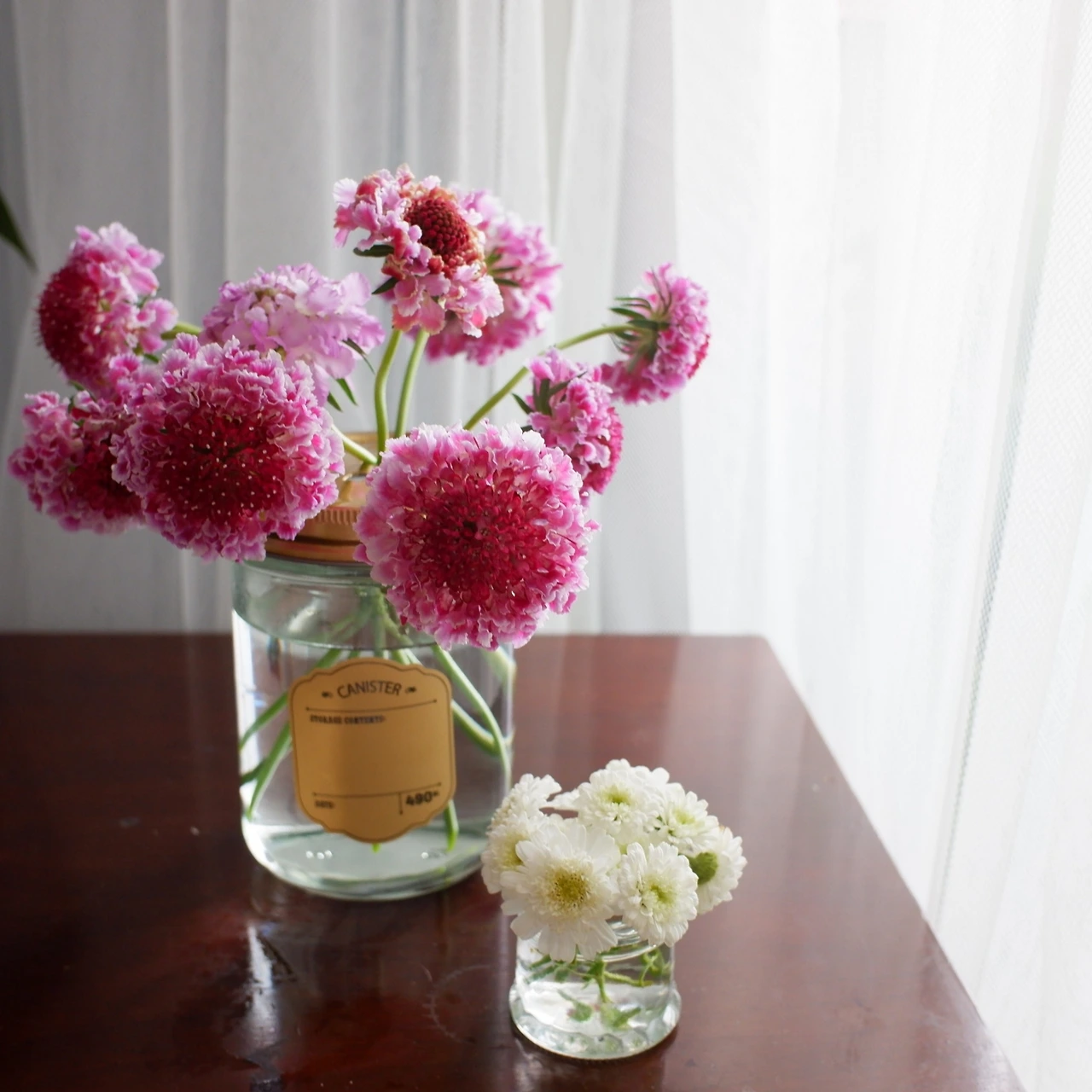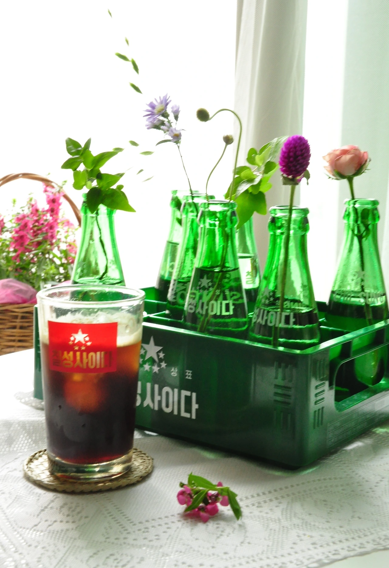 양념병 뚜껑에 구멍 빵빵 몇 개 뚫어 가느다란 스카비오사 몇 줄기 넣어준 양념 유리병은 투명하고 시원한 화병으로 변한다.