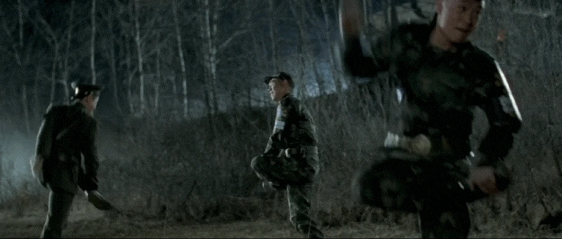 소피 소령(이영애)이 총기사건의 용의자 이수혁 병장(이병헌)과 대화를 시도하려 다가가자, 선임은 소령에게 “세상엔 두 종류의 인간이 있어. 빨갱이, 그리고 빨갱이들의 적. 여기에는 중립 설 자리 없어. 선택만 있을 뿐이야.”라고 말한다. ‘빨갱이들의 적’이라는 대사가 들리는 짧은 순간 무려 ‘두 마리’를 사살한 영웅으로 칭찬받는 이수혁 병장의 얼굴이 클로즈업되는데, 이를 부인하듯 허공을 응시하는 그의 공허한 눈은 단번에 그가 선임의 말과 달리 어느 편에도 속하지 않음을 암시한다. 그렇다면 이수혁 병장은 ‘중립’인 것인가? <공동경비구역 JSA>는 총기난사 사건의 진실을 관객이 소피 소령과 함께 파헤쳐가는 구조로 시간을 역행하여 이야기를 전달한다. 영화를 감상한 관객은 이수혁 병장이야말로 북한과 가장 가까우면서도 영화 내 어느 등장인물보다 멀리 도망간 이중적인 인물임을 알 수 있다.