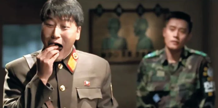 카메라는 눈이다. 관객은 카메라를 통해 영화의 이야기를 본다는 점에서 촬영 감독은 카메라의 각도를 조작하여 효과적으로 메시지를 전달한다. 북한 초소에서 마지막 작별 인사를 위해 남성식과 이수혁이 북한 초소를 방문하는 장면에서, 이 넷은 전쟁 중인 두 나라의 경계 최전방에서의 추억을 함축하듯 모자까지 바꾸어 쓰며 사진을 찍는다. 이때, 남성식은 카메라 구도를 흥미롭게도 계속 불편한 듯이 바꾸고 결국 무릎을 꿇으면서 셔터를 누르는데, 이는 벽에 걸려있는 김일성과 김정일 지도자의 초상화가 배경에 계속 보이기 때문이다. 카메라의 시점은 모자까지 바꿔 쓰고 환하게 웃는 세 병사들과 그 뒤에 걸린 북한의 지도자들 사이에서 갈등하게 되고, 남한과 북한의 마지막까지 놓을 수 없는 긴장감을 상징한다. 당장 앞에 보이는 소중한 우정이 냉혹한 현실의 그림자에서 사라지는 듯한 효과를 주기도 한다. 아이러니하게도 너무나도 가까워진 그들은 아직도 너무 멀기만 한 것이다.