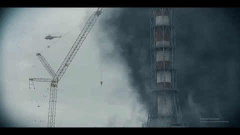 철저한 1인칭 시점을 활용한 연출은 발레리 레가소프가 사고 대처 지휘를 맡게 되면서 더 도드라진다. 폭발 이후, 노심 용해로 인한 지하수 오염을 막기 위해서 핵연료를 식혀야 했던 소련 당국은 헬리콥터로 모래와 붕소를 원자로 상공에서 뿌리는 전략을 선택한다. 발레리 레가소프는 헬리콥터가 원자로 상공을 스쳐 지나가도록 지시하지만, 엄청난 양의 방사능을 직격으로 맞은 헬리콥터는 그 안의 탑승 인원과 함께 그대로 원자로 위로 추락한다. 이때, 카메라는 헬리콥터 안에 있지 않다. 긴박한 무전 신호와 불꽃이 튀기며 추락하는 헬리콥터 내부의 장면은 극적인 상황을 각인시킬 수 있었을 것이다. 그러나 카메라는 멀리서 헬기가 추락하는 모습을 지켜보고 있는 발레리 레가소프와 같이 있다. 2차 폭발을 막을 수 있을 것이라고 생각했던 그의 희망은 장난감처럼 부서지는 헬리콥터와 함께 추락한다. 전지적 시점이 아닌 레가소프의 위치에서 관객은 그와 함께 좌절과 절망을 마주하게 되는 것이다.