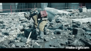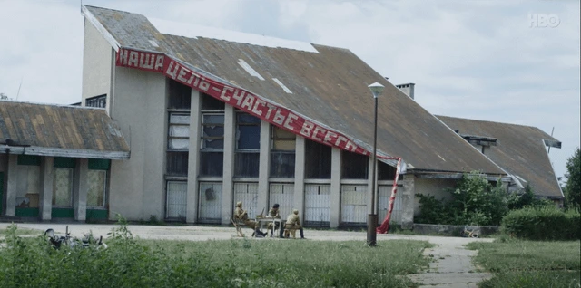 암울한 멜로디가 흐르며 시멘트가 죽은 동물들의 사체에 부어지는 것을 덤덤하게 바라보고 있는 세 병사들 뒤로 크게 걸려있는 현수막이 있다. <체르노빌> 4화의 제목은 "The Happiness of All Mankind"으로, 당시 소련 정권의 선전 선동 문구인 "우리의 목표는 전 인류의 행복이다!" (Наша цель - счастье всего человечества!)에서 사용된 문구이다. 해당 선전 선동 문구가 적힌 현수막은 다 뜯어져 내리고 있고, 거주민들이 이미 떠나간 유령 마을에서 청년들은 무슨 작업을 하고 있는가. 전 인류의 행복을 위해 이들은 고스란히 방사능에 노출되어 서서히 죽어가고 있다.