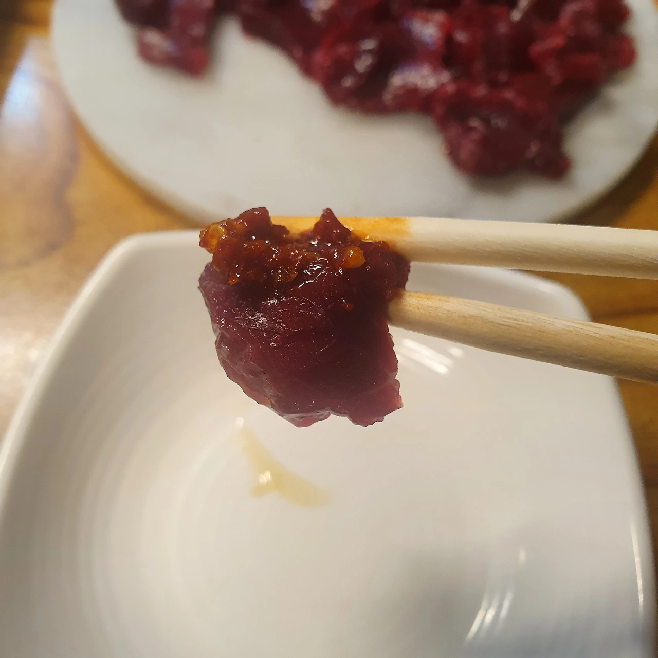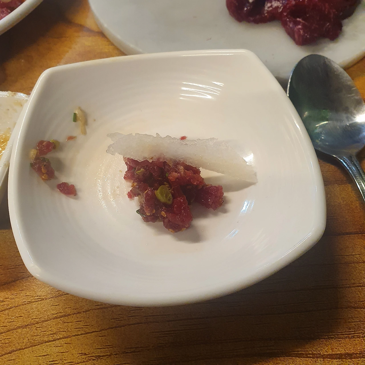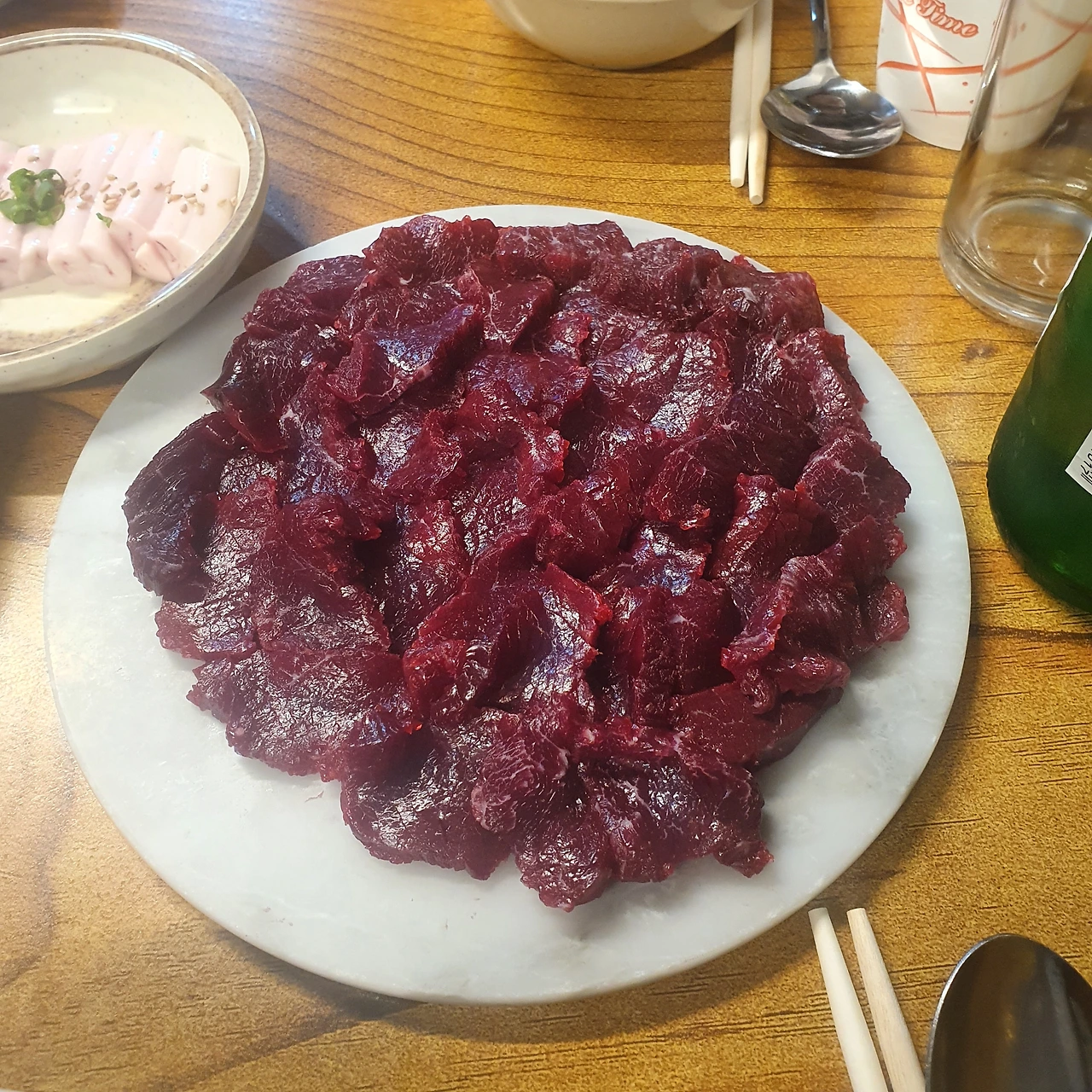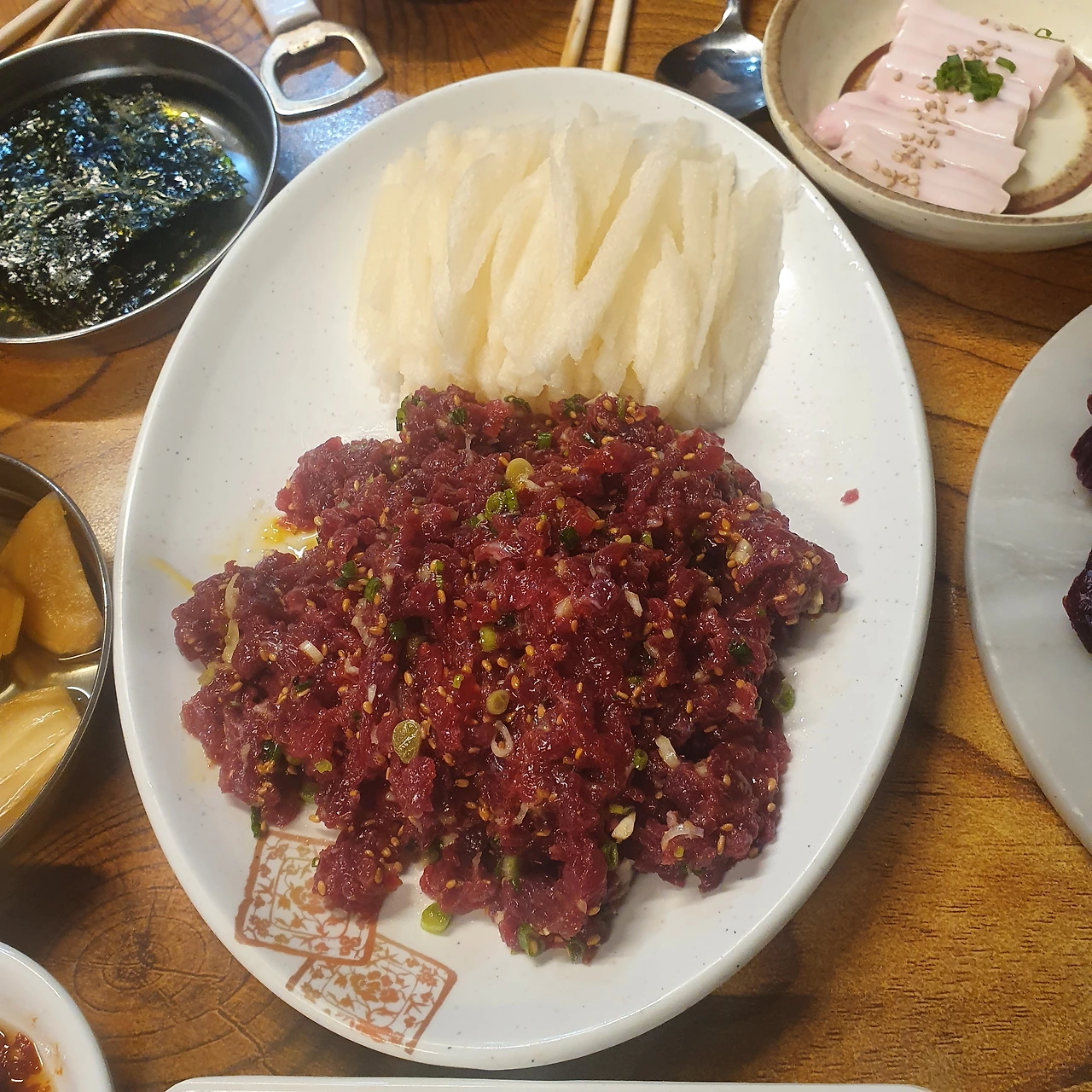 우리는 육회와 뭉티기가 나오는 한상세트를 주문했다.