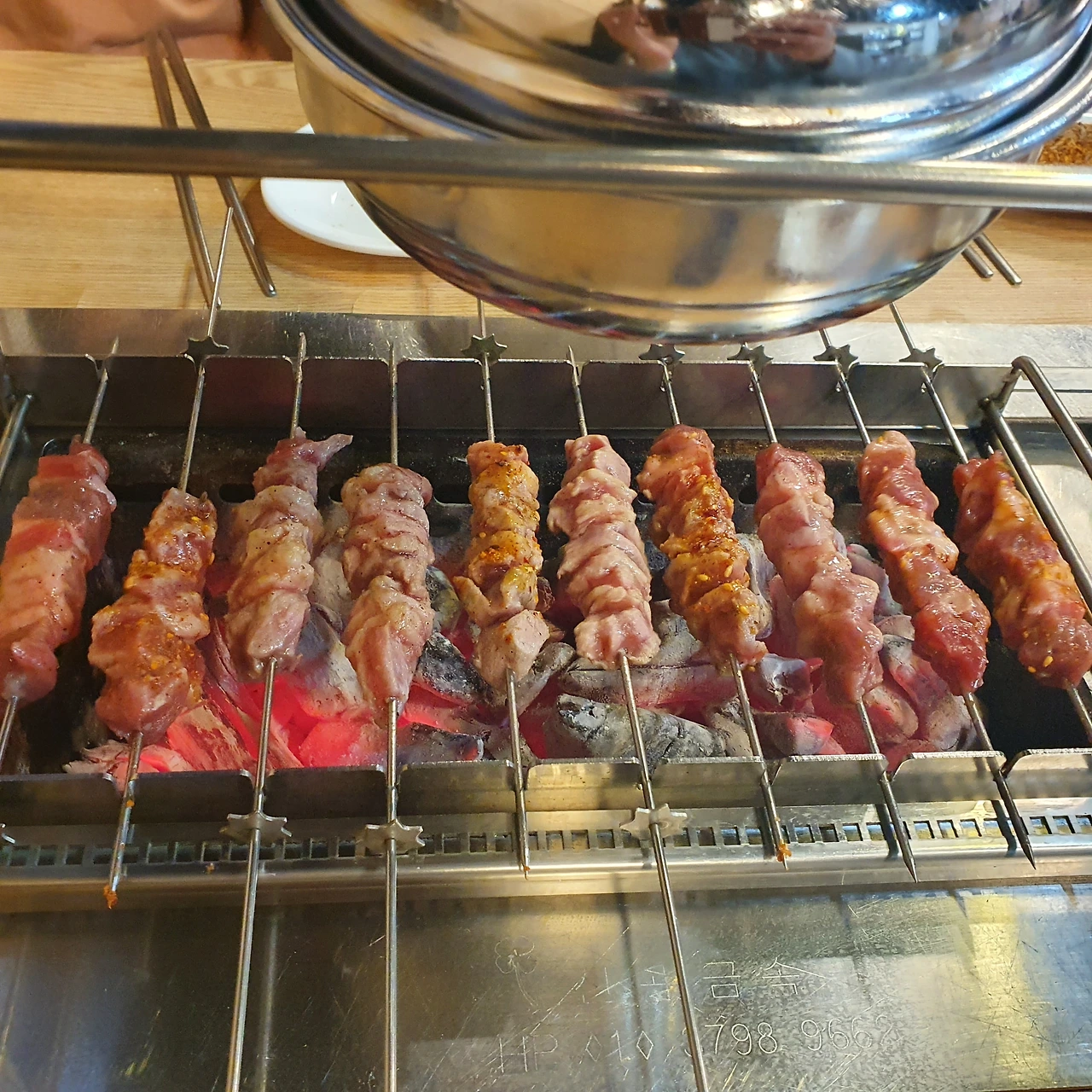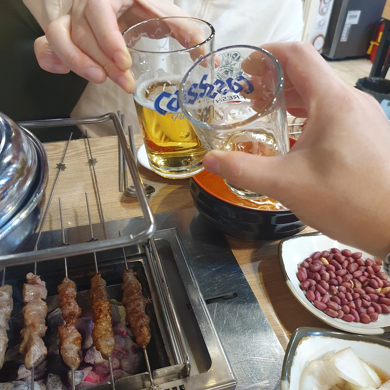 주문한 양꼬치를 화로에 올려두고는 먼저 한잔 했다.