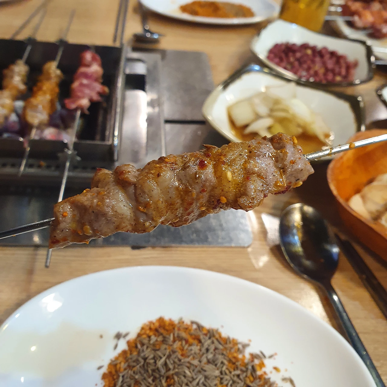 들어가자마자 양꼬치와 양념이 된 매운 양꼬치를 하나씩 주문하고는