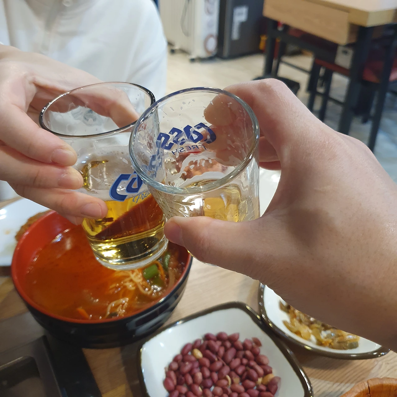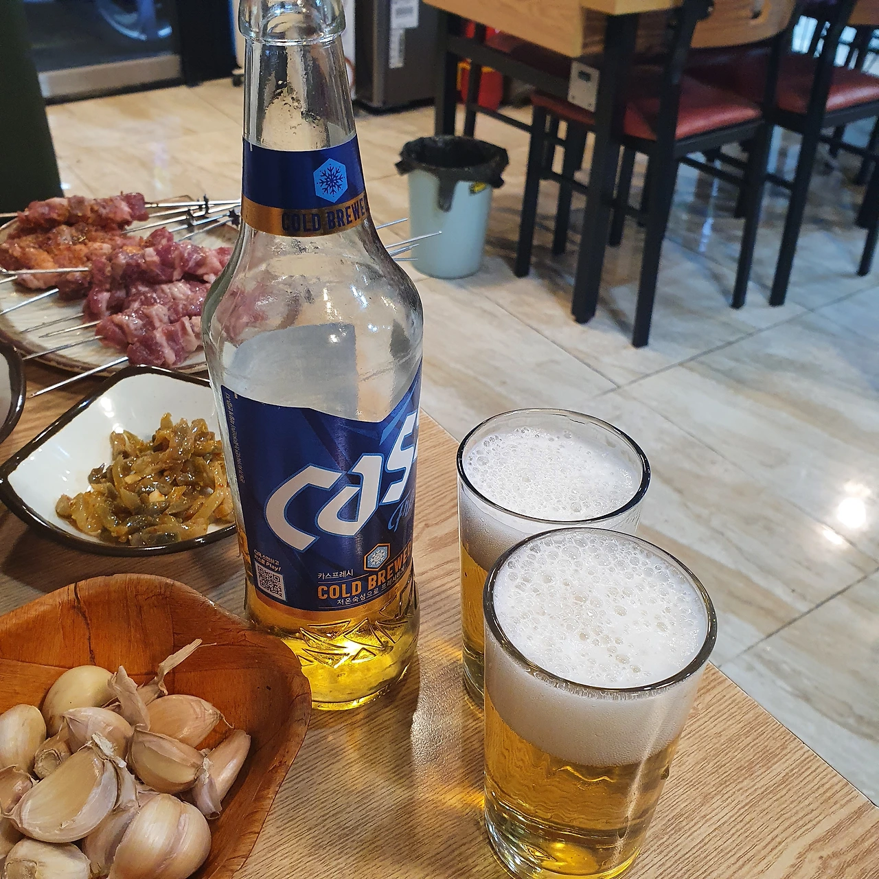 양꼬치 한 점마다 잔을 부딪혔더니 금세 잔이 비고 넉넉하던