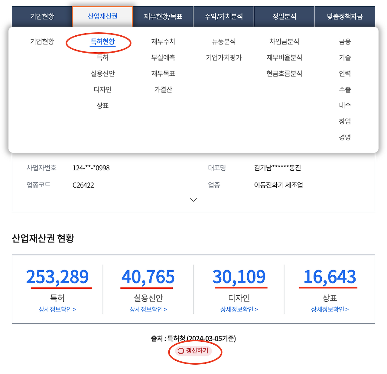비즈탑 특허현황특허, 실용신안, 디자인, 상표 이렇게 4개의 카텍고리로 정보를 보여주며, 갱신하기를 통해서 정보가 갱신되었는지도 확인이 가능합니다.