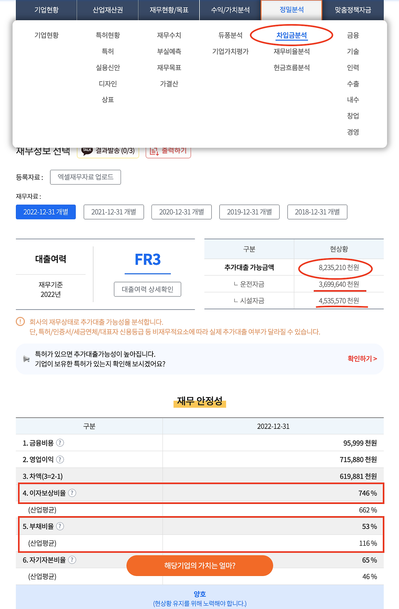 컨설턴트 본인이 정말 잘 사용하는 분석 서비스라고 합니다. 컨설팅할 기업이 이용하고 있는 대출과 이자 그리고, 추가로 대출이 가능한지에 대한 가이드를 제공해 주기 때문입니다.