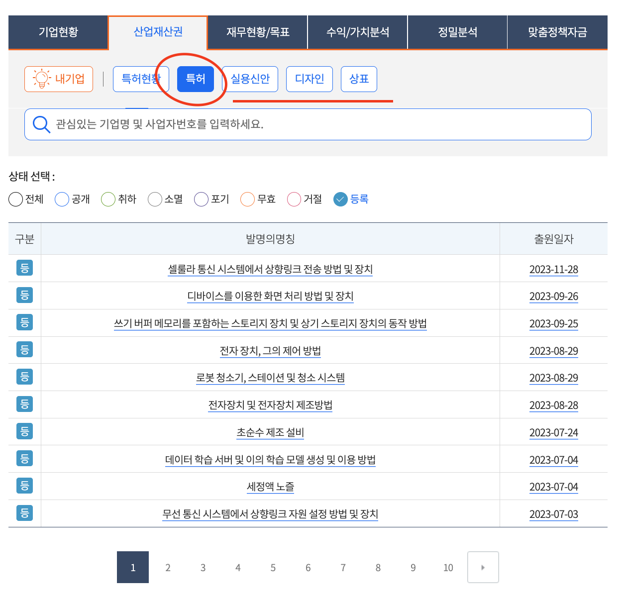 비즈탑 특허 리스트특허를 클릭하면 특허상태에 따른 정보를 소팅해서 볼 수 있다.