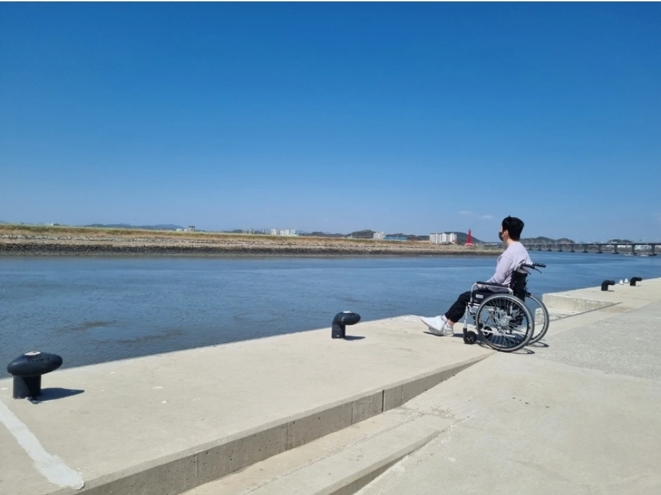 차 밖으로 내려서 휠체어를 타고 밖을 구경한 건