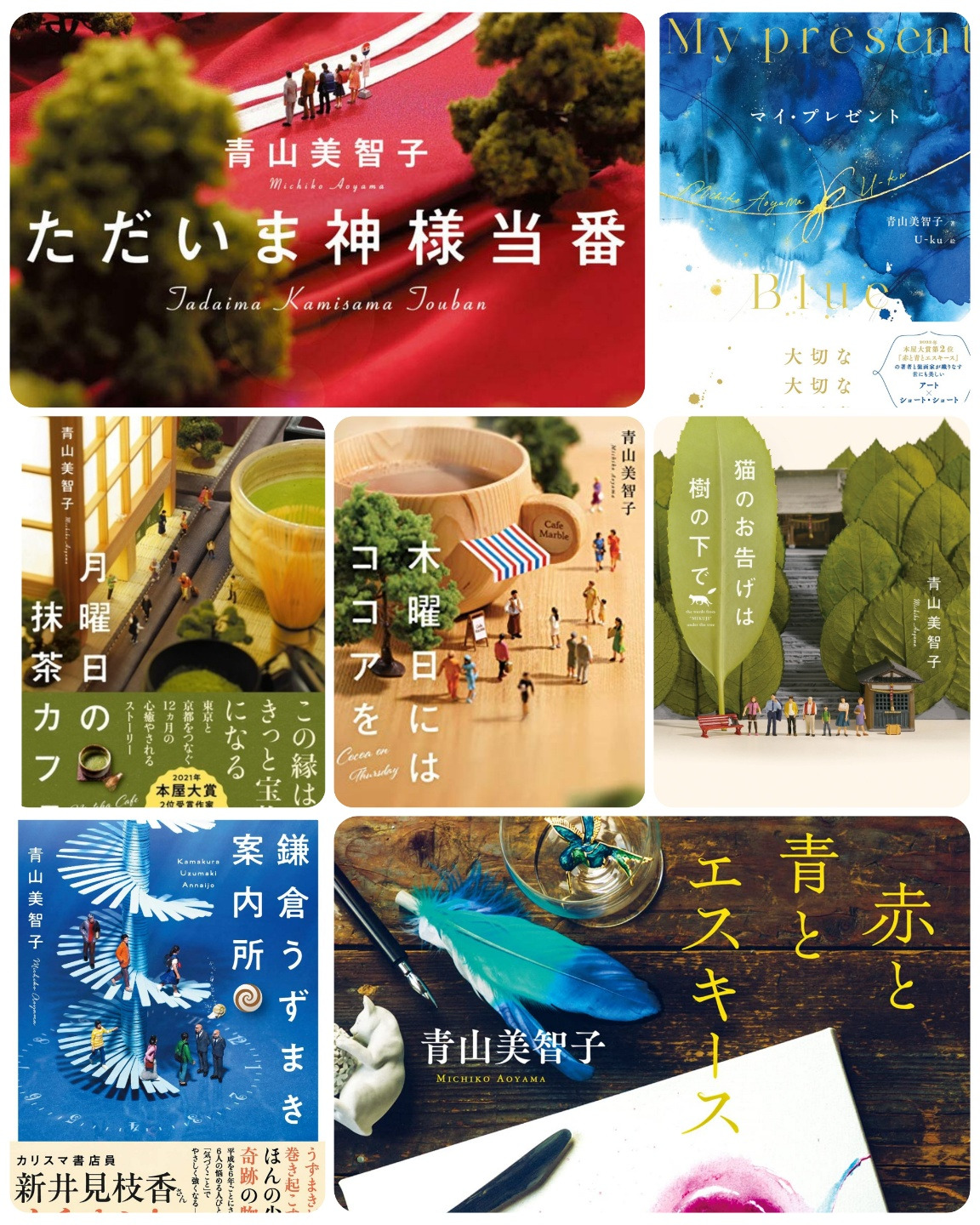 ママにハンド・クラップ!, 街灯りの向こうに, 木曜日にはココアを, お探し物は図書室まで, 猫のお告げは樹の下で, 月曜日の抹茶カフェ, 赤と青とエスキース가 모두 수상 작품이라 그야말로 필력은 인정받은 작가다. 그녀의 작품은 아직 두 권밖에 안 읽어봤지만, 잔잔히 마음에 스며드는 전형적인 일본 특유의 힐링계 느낌이다. 오가와 이토나 무레 요코, 오야마 준코, 유즈키 아사코를 사랑하는 독자라면 아오야마 미치코도 분명 마음에 쏙 들 것 같다.