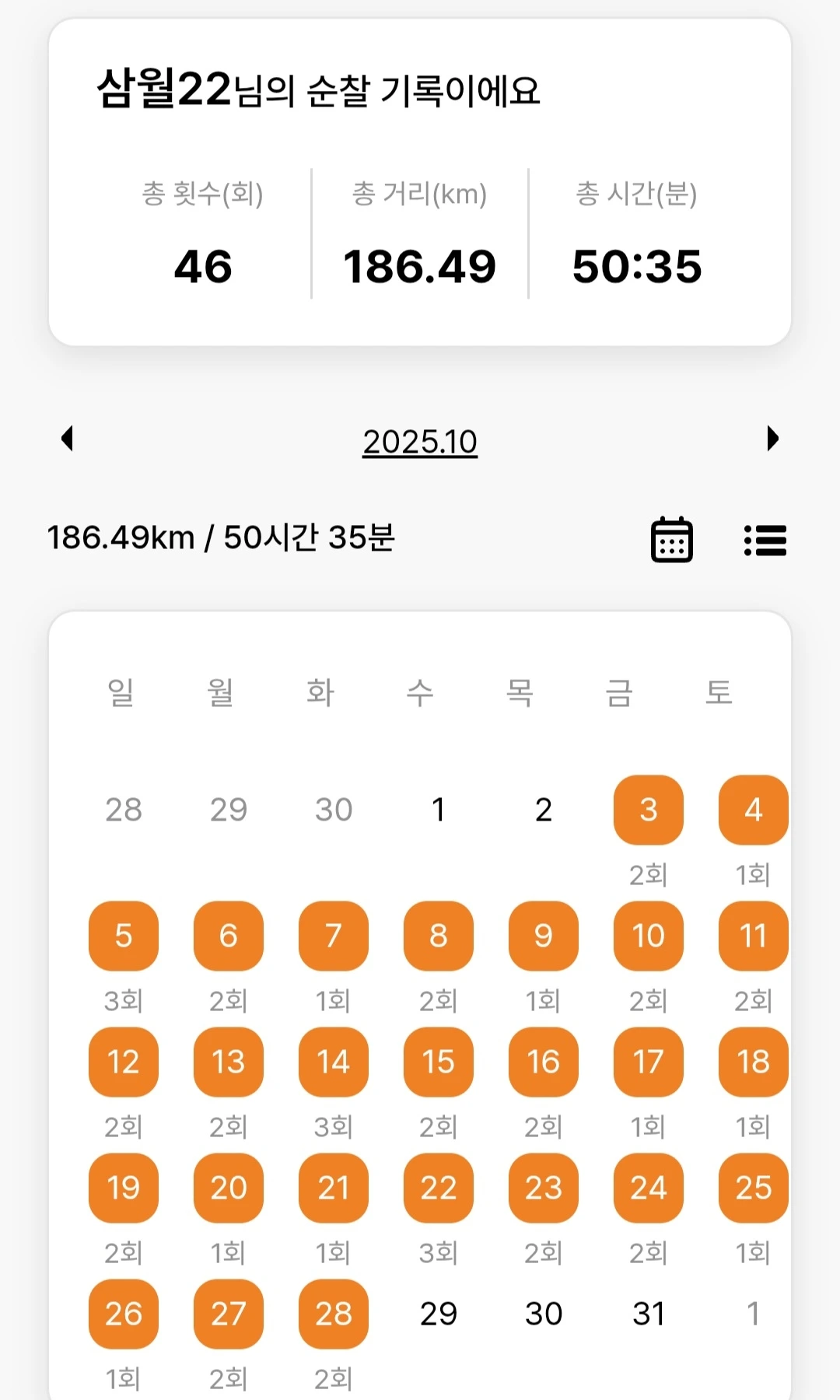 하루에 두 번 이상 꼭 나가는데 어플이 가끔 튕기기도 하고 중복 로그인이 안 돼서 저 이외에 다른 사람이 나가면 저장을 못하고.. 등등의 사유로 순찰할 때마다 온전히 저장은 안 되었지만 그래도 꾸준히 열심히 역할을 다하고 있습니다!