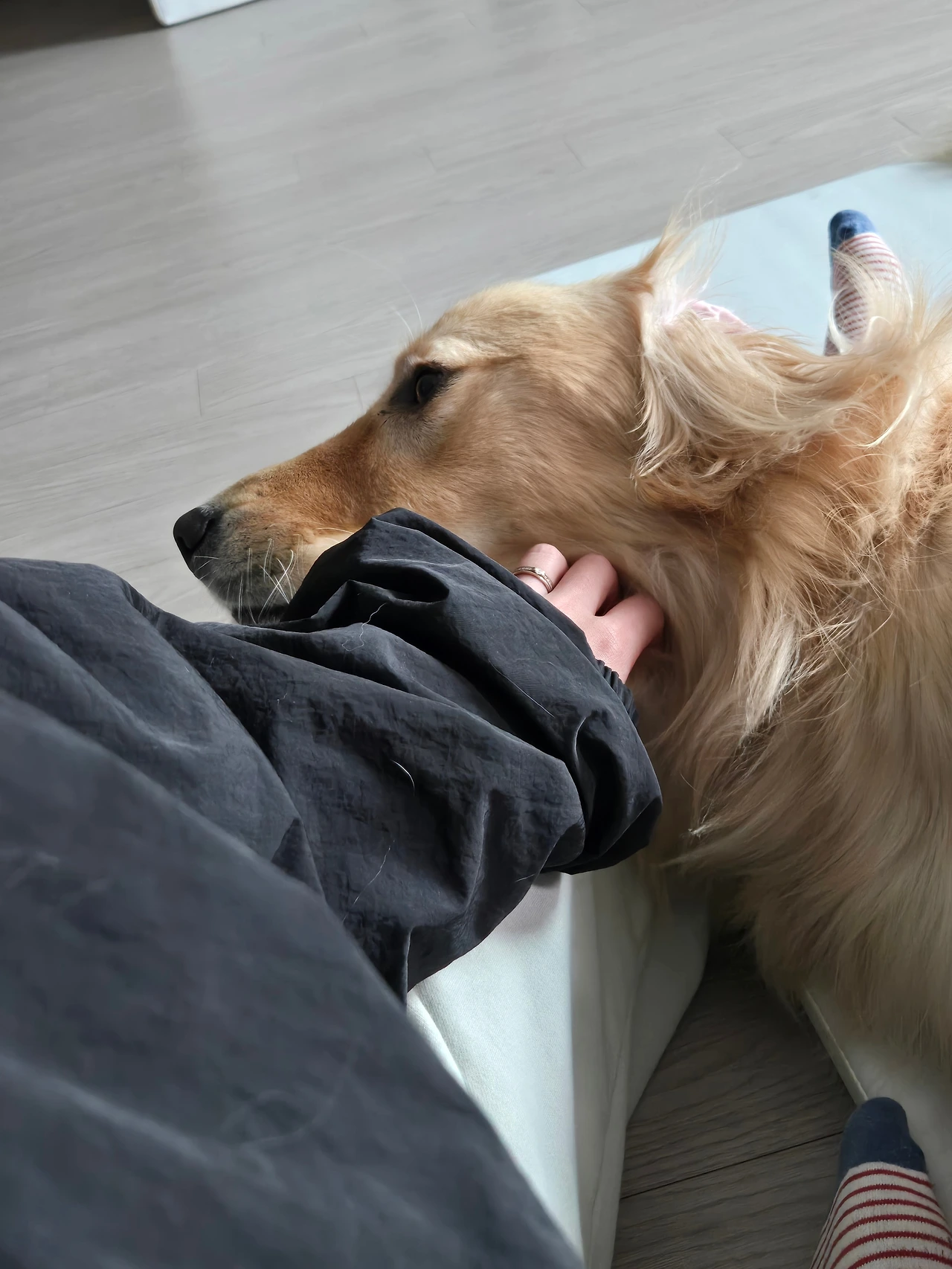 거실에 앉아 기다리는데 내 다리를 베고 눕는다.